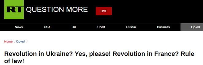 “今日俄罗斯”(RT)3日的一篇题为《在乌克兰革命?好的,快请!在法国革命?请遵守法律!》的报道提出了上述质疑。对此,他们的答案是:且不谈有多么讽刺,看起来,似乎暴力革命与政权更迭只是针对那些远离西方权力中心、由不合作政府领导的国家的解决办法。