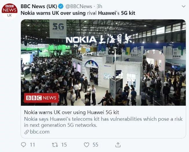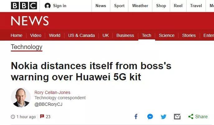昨天上午,英国BBC先是发布了一篇名为“诺基亚警告英国不要用华为5G设备”的报道,称诺基亚公司的首席技术官(CTO)马库斯⋅韦尔登(Marcus Weldon)表示华为公司的5G设备并不安全,存在安全漏洞,会给5G网络带来风险。