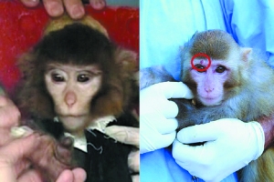公布的送入太空前的活猴照片(左图)。1月30日新闻发布会上的猴子,红痣不见了,且毛色较深。(右图)