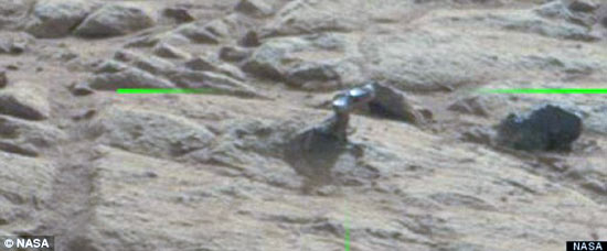 这个金属物体形似机器人手指、从一块火星岩石中伸出,在火星表面投下黑色的阴影。