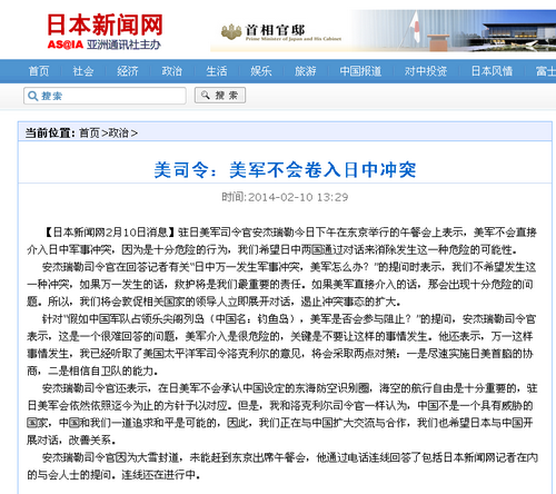 安杰瑞勒司令官在回答记者有关“日中万一发生军事冲突,美军怎么办?”的提问时表示,我们不希望发生这一种冲突,如果万一发生的话,救护将是我们最重要的责任。如果美军直接介入的话,那会出现十分危险的问题。所以,我们将会敦促相关国家的领导人立即展开对话,遏止冲突事态的扩大。