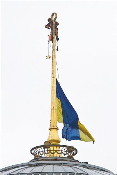 2月25日,乌克兰基辅,示威者敲掉议会大楼顶上象征苏联时期的五角星标志。