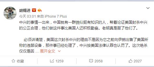 中兴的事情一出来,中国就有一群貌似挺有知识的人,帮着论证美国封杀中兴的公正合理,他们做这件事比美国人还积极勤奋。老胡真是服了他们了。