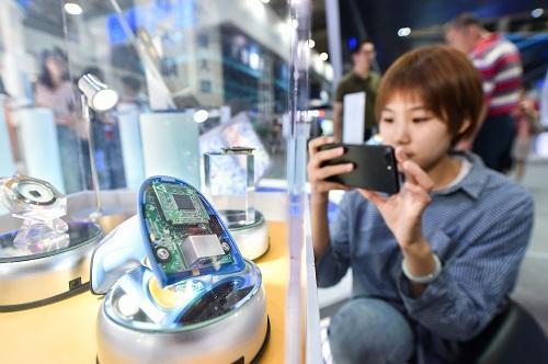 2018年4月23日,在首届数字中国建设成果展览会上,观众在拍摄数字公民安全解码芯片。新华社记者宋为伟摄