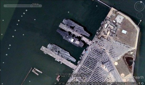 美国诺福克航母母港航母专用停泊码头,也是大宽度突堤码头,但宽度和长度要比中国航母码头要小。