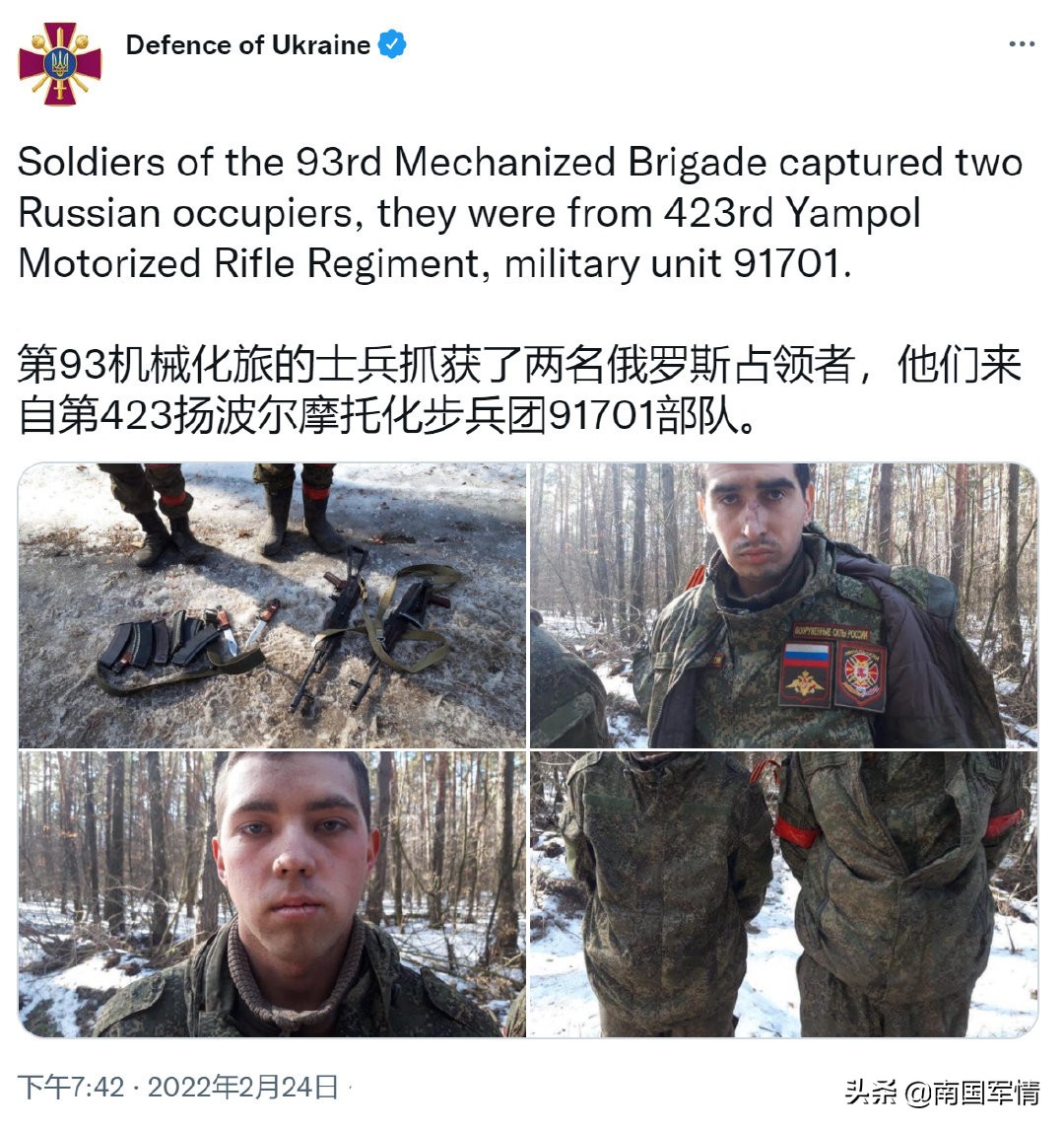 24日,乌克兰国防部公开宣布称:“乌克兰政府军已经俘虏到2个俄罗斯士兵。”从画面来看,这两名俄罗斯军队士兵都十分年轻,看起来都很岁数不大,他们也是俄罗斯的百姓,就这样被俘虏。看军装是俄军第93机械化旅第423近卫扬博尔摩托化步兵团。一个来自达吉斯坦,一个来自萨拉托夫,其中一名被俘虏的俄军士兵,还有女朋友。据称这两个人执行侦察任务的时候,误入到乌克兰政府军阵地,随后被俘虏的。这是开战以来,乌克兰军队第一次俘虏俄军官兵。#俄军动态##乌克兰#