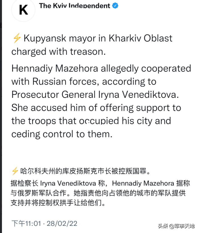“一名市长把城市和平移交给俄罗斯,被乌克兰政府指控为叛国罪。”,“在哈尔科夫地区,库皮扬斯克市长承认将城市移交给占领者”,2月27日,乌克兰媒体报道称:“乌克兰库皮扬斯克市的市长,把城市和平移交给俄罗斯,被乌克兰政府指控为叛国罪”。库皮扬斯克市的市长马采戈拉宣布:“已经与俄军达成了就城市权力移交达成协议”。马采戈拉表示:“俄罗斯军队一个营的指挥官打电话提议谈判。如果拒绝,这座城市将承受一切后果”。我决定参加会谈,避免在该地区造成人员伤亡和破坏城市。”库皮扬斯克市的市长指出,市警察局局长纳塔利娅舍甫琴科在谈判期间在场。马采戈拉表示: “我们讨论了军队的行动,包括进城、确保秩序和安抚居民。俄军让我们相信,不会影响城市的生活;学校、幼儿园、医院、杂货店和交通将继续运行,城市将有秩序。”库皮扬斯克,是在哈尔科夫东南的一个小城。这个市长完全可以理解。真的不打,保护了老百姓。就对了,何必给乌克兰那些随时跑路的政客卖命。#乌克兰#