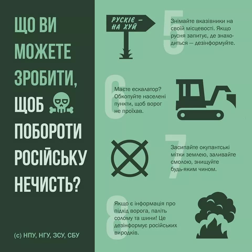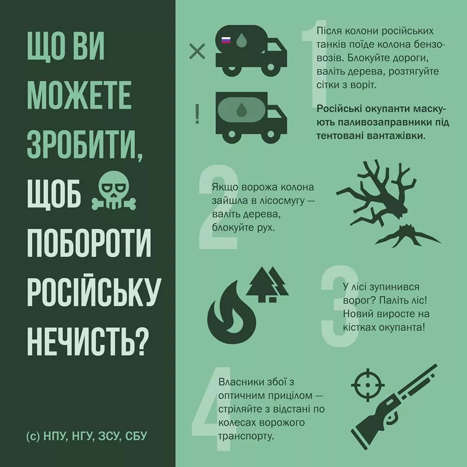 乌克兰正在教老百姓进行游击战,各种坚壁清野,伏击后勤车队,打运输车,打油罐车,砍树堵路,挖掘机挖路,俄军所在的森林纵火,埋地雷,改路牌,不给手机,用监控汇报俄军动向,远程打冷枪,遇到俄军来了就点燃轮胎。乌军目前的战术也龟缩在城市里,避免野外浪战,放过穿插进来的俄军,打掉后面的保障车队,发誓要让俄军陷入人民战争的枉洋大海,看上去有点疯啊。