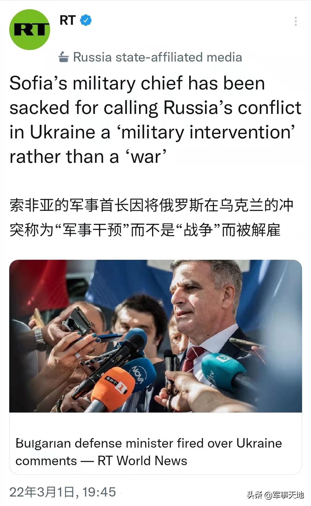 “说好的西方言论自由呢?”,“保加利亚国防部长因将俄罗斯与乌克兰的冲突,称为“军事干