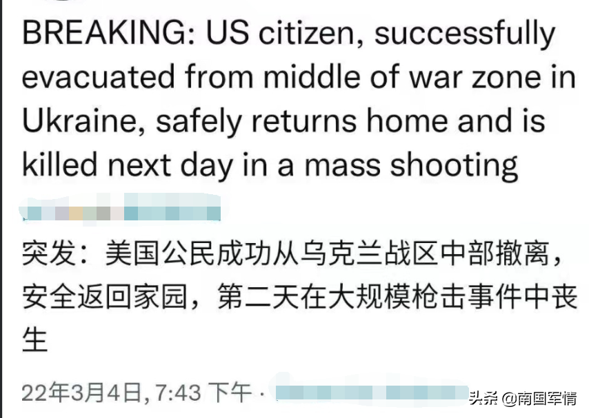 “自由民主美利坚,街头枪战每一天”,“逃过了乌克兰战争,没逃过美国人的子弹!”3月4日,美国方面有消息称:“美国公民成功从乌克兰战区中部撤离,安全返回家园,第二天在大规模枪击事件中丧生。”这并不奇怪,早前乌克兰总统泽伦斯基都说过:“美国公民留在基辅比美国城市都要安全!”美国前总统特朗普也说过:“阿富汗都比芝加哥安全。”现在看来是他们更了解美国。特别是,美国渲染俄乌开战的时候。乌克兰战时给平民发枪,美国平时人手好几把枪!可以对比一下,美国那是天天枪击案,“还是美国家乡的子弹对味儿”。美国本土一直比战区危险,关键是死法还五花八门,服药过量,枪击死亡,被警察跪死等。只有想不到,没有美国白人做不到。下一个剧情很可能是:“美国公民从乌克兰危机中成功返回美国,在一次大规模枪击事件受轻伤,医疗期间感染新冠死亡”。#美国真相##美国枪击案#