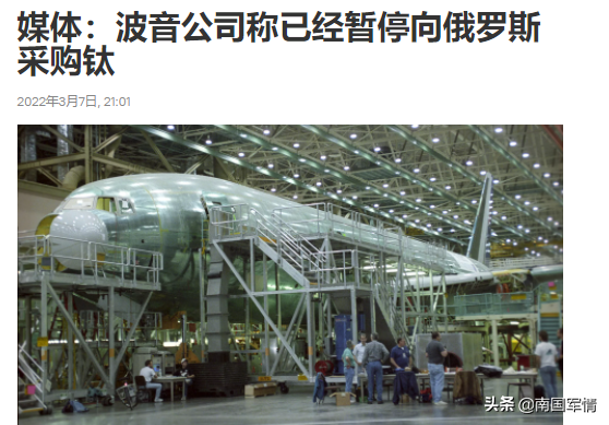 “波音表示暂停从俄罗斯联邦采购钛金属,并关闭莫斯科和基辅的技术部门 ”,3月7日,美国媒体报道称:“美国波音公司已经暂停向俄罗斯采购钛,并关闭了波音公司驻莫斯科和基辅的技术处。”,“美国波音公司宣布,已经停止向俄罗斯采购钛,不再向俄罗斯航空公司发运备件。”波音一直向全球规模最大的,俄罗斯钛生产商VSMPO-Avisma公司订货。波音公司2021年11月与该公司签署了战略伙伴关系备忘录,这家俄罗斯公司成为波音所有新型民用商务机,主要钛供应商。暂停采购,到底是波音的损失大,还是俄罗斯的损失更大?最大产钛也就中俄了,波音自己想办法?疫情导致波音民用客机几乎停产,再加上一个公司随随便便的终止合同。以后谁还敢买波音的飞机!