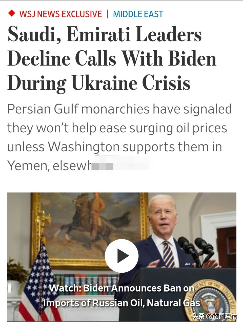 美国宣布禁运俄罗斯石油、天然气后,3月8日,沙特王储小萨勒曼和阿联酋王储扎耶德拒绝与拜