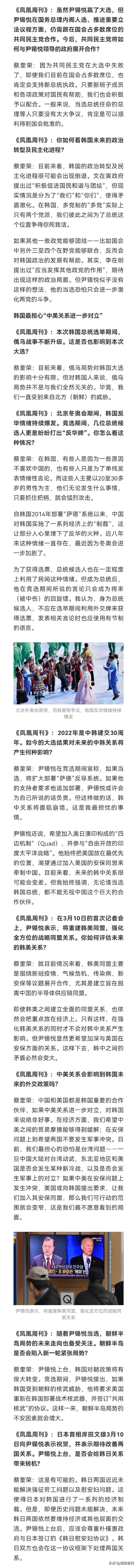 【文在寅政府智囊:尹锡悦若进一步部署萨德,会让中韩关系崩塌】韩国大选落幕,尹锡悦胜出,其竞选期间暴论不断,似乎为他上台后的中韩关系发展平添了不少变数。就此,共同民主党政策委员会政策室长蔡奎荣接受@凤凰周刊 专访,对本届韩国大选进行解析,并就尹锡悦的未来执政做出预测。专访内容还是有些干货的。像是蔡奎荣谈到他眼中的文在寅,“文在寅总统是非常善良且有原则的人,可以说是一个没有瑕疵的道德主义者。但并不是善良的人就能当好总统。这样的人成为总统,反而会让国民有逆反心理。例如,相比奥巴马,美国民众更期待特朗普这样的人成为总统。同样,韩国民众也期待风格鲜明、性格更强的总统。这或许是这个时代的潮流。”又如,他谈到目前的执政党不愿意迎合反华情绪:“共同民主党虽然理解国民的反华情绪,但作为总统候选人不管是否喜欢中国,都应当将中国视为韩国的重要合作伙伴。无论外交还是经济上,我们都做不到排除中国。”蔡奎荣还表示,为了获得选票,几个总统候选人在一定程度上利用了民间的反华情绪。“但成为总统后,他在竞选期间所说的言论只会成为将来(被中伤)的回旋镖。”最为直接、可以被拿来检验的就是,“尹锡悦在竞选期间宣称,如果当选,将扩大部署‘萨德’反导系统。如果他的支持者要求他追加部署,尹锡悦或许会为自己所说的话负责。但这样做的话,韩中关系将面临崩塌。这是我最担忧的事情。”