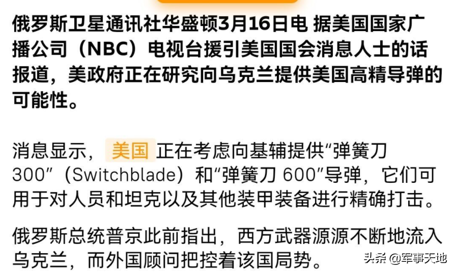 3月16日,美国总统拜登宣布:“在向乌克兰提供价值8亿美元的军援,包括800套防空系统,包括远程防空导弹,9000个反装甲系统,7000件小型武器,包括机枪、霰弹枪、榴弹发射器,2000万发弹药,位置数量的无人机。”美参议院外交委员会成员麦考尔称:“美国提供的S-300防空系统已经进入乌克兰。”美国众议院外交事务委员会负责人、共和党众议员迈克尔·麦考尔表示:“乌克兰将从北约国家获得了一批S-300防空系统。另据报道美国正在与斯洛伐克、保加利亚和希腊谈判,争取三国将所拥有S-300防空系统提供给乌克兰”。“目前斯洛伐克已初步同意向乌克兰提供S-300防空系统,但希望美国和北约能够保斯洛伐克立即获得替代的防空系统。同时,美国政府已要求希腊交付其从塞浦路斯收到的,俄罗斯制造的S-300防空导弹系统。希腊必须尽快将其交付给乌克兰。同时,美国正向乌克兰提供100枚“弹簧刀”巡飞弹美国正在考虑向基辅提供“弹簧刀300”和“弹簧刀600”导弹,这种巡飞弹可以10公里外,对俄军人员和坦克以及其他装甲装备进行精确打击。俄罗斯理论上可以让美国武器运不进来,其实可以对边境地区24小时无人机察打一体行动,有制空权就应该出动大量武装无人机,再导弹洗地,无人机点杀。但是俄军想炸,也炸不了!关键俄军自己的巡飞弹还是飞翼器外形,而且电子元器件确实和西方代差有点大。100枚改变不了战场局势,但又能对俄军一定打击,“慢慢耗血”,长期看俄军会陷入泥潭!没有强大工业、科技、经济基础的俄罗斯,正在打一场消耗战。#俄军动态##美国##乌克兰##导弹#