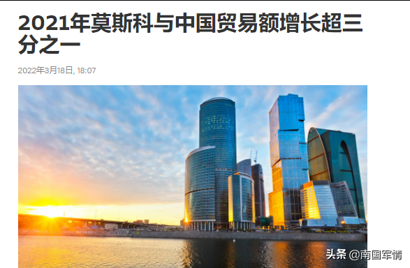 “俄媒:2021年莫斯科与中国贸易额增长超三分之一”。3月18日,俄罗斯媒体报道称:“俄罗