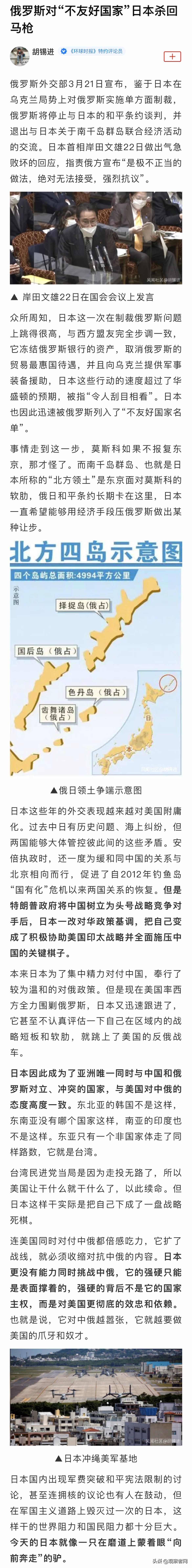 【俄罗斯对“不友好国家”日本杀回马枪】 胡锡进:众所周知,日本这一次在制裁俄罗斯问题