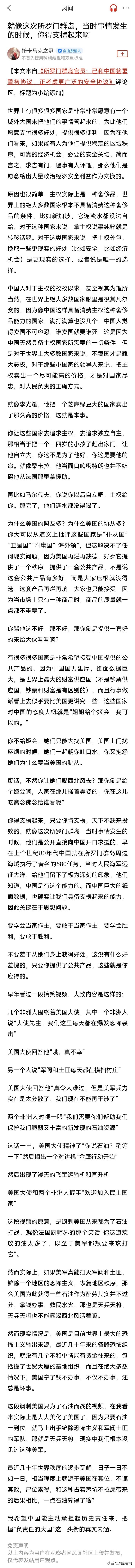 托卡马克之冠:世界上有很多很多国家是非常非常愿意有一个域外大国来把他们的事情管起来的,为此他们愿意支付很多好处,提供很多便利,因为在他们看来,如果能有人为他们提供稳定的区域秩序,可靠的经济机会,必要的安全关切,简而言之,求告有门,遇事有人评理,那么他们是愿意给出大量政治经济安全利益作为交换的。原因也很简单,主权实际上是一种奢侈品,世界上的绝大多数国家根本不具备消费这种奢侈品的条件。……最近几十年世界秩序的逐步瓦解,日子一日不如一日,相当程度上就源于美国在其位,不谋其政,尸位素餐,和这种占着茅坑不拉屎带来的后果相比,一点石油算得了啥?我希望中国能主动承担起历史责任来,把握“负责任的大国”这一头衔的真实内涵。