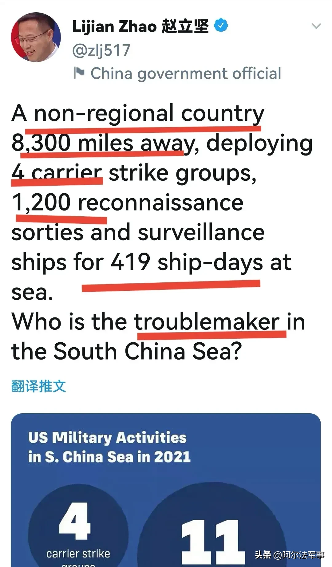 赵立坚还是那么有战斗力,又抛出一组数字,对美国进行“去谎言化打击”。他在推文中列举事实真相:一个8000英里之外的国家,在2021一年中,硬是在中国南海部署过4艘航母打击群,1200架次侦察机,419次间谍船。美国一天到晚嚷嚷中国威胁,拿出来的却是一个个经过剪切和编辑的事例,试图以局部代替整体。赵立坚则通过对事实全貌的数字化处理,让大家一眼便可以看清到底谁才是麻烦制造者。