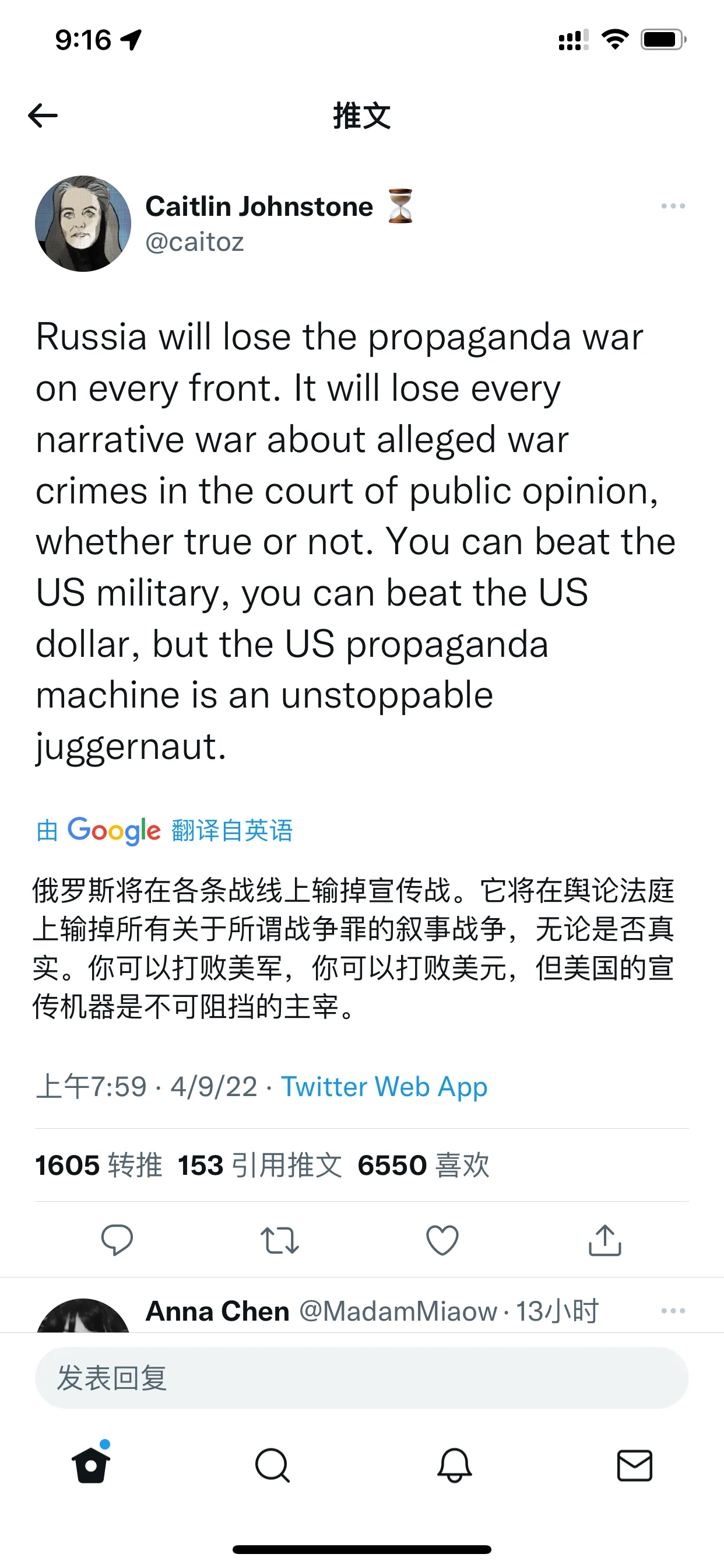 俄罗斯将在各条战线上输掉宣传战。它将在舆论法庭上输掉所有关于所谓战争罪的叙事战争,无 2022-04-10 09:33:09 刘庆彬 俄罗斯将在各条战线上输掉宣传战。它将在舆论法庭上输掉所有关于所谓战争罪的叙事战争,无论是否真实。你可以打败美军,你可以打败美元,但美国的宣传机器是不可阻挡的主宰。 俄罗斯 美国 宣传战 狂踩 (0) 0% 点赞 (2) 100%