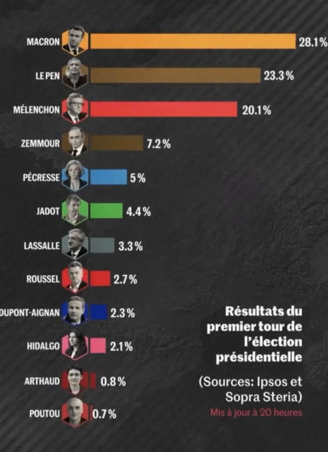 俄乌冲突之后,整个世界的运行逻辑可能都被重置了。除了俄乌这两个当事人之外,首当其冲影响到的,就是欧洲国家。虽然欧洲的政客看上去让人难以理解,为了配合美国的战略,总是在牺牲本国的利益。但是欧洲的人民也不净是傻子,也有些国家是拎得很清的。比如前段时间,塞尔维亚和匈牙利先后进行了大选,最后都是现任的领导人连任,而武契奇和欧尔班都被视作是以本国利益优先,而拒绝跟随美国战略的典型代表。现在这个挑战来到了欧盟的核心,法国身上。从昨天开始的法国总统选举,第一轮投票将会在今天正式结束。按最新的出口民调显示,现任总统马克龙以28.1%的得票率排在第一,法国极右翼政党“国民联盟”的领导人玛丽娜·勒庞则以23.3%的得票率占据第二名。按照法国的选举规则,如果没有候选人在第一轮投票获得过半数选票,那么得票前两名的候选人将进入第二轮角逐,第二轮投票时间定于两周之后,也就是4月24日。谁最后能胜出,目前看还有很大的悬念,最主要的原因就在于,之前马克龙的优势被认为很大,民调也是大幅领先,但实际到了投票阶段,领先优势大幅缩小。按最新的民调,第二轮投票马克龙的优势已经进一步缩小。而其他在第一轮淘汰的右翼候选人,都在呼吁第二轮把票投给勒庞,她是个极右翼。勒庞主张非常激进,马克龙过去说北约已经脑死亡,勒庞是一直主张法国应该退出北约,甚至为了法国的利益,可以考虑退出欧盟。原本她这样的极右翼,可能确实没有太大的机会,但是俄乌冲突之后,欧洲人开始感觉到做美国的跟屁虫不一定有好果子吃。法国是欧洲的革命老区,群众有强烈的反抗意识,虽然抵抗精神不咋地,但是可贵就可贵在觉醒得早。欧洲能不能走上独立自主的康庄大道,原本的一潭死水,现在暗流已经开始动起来了。