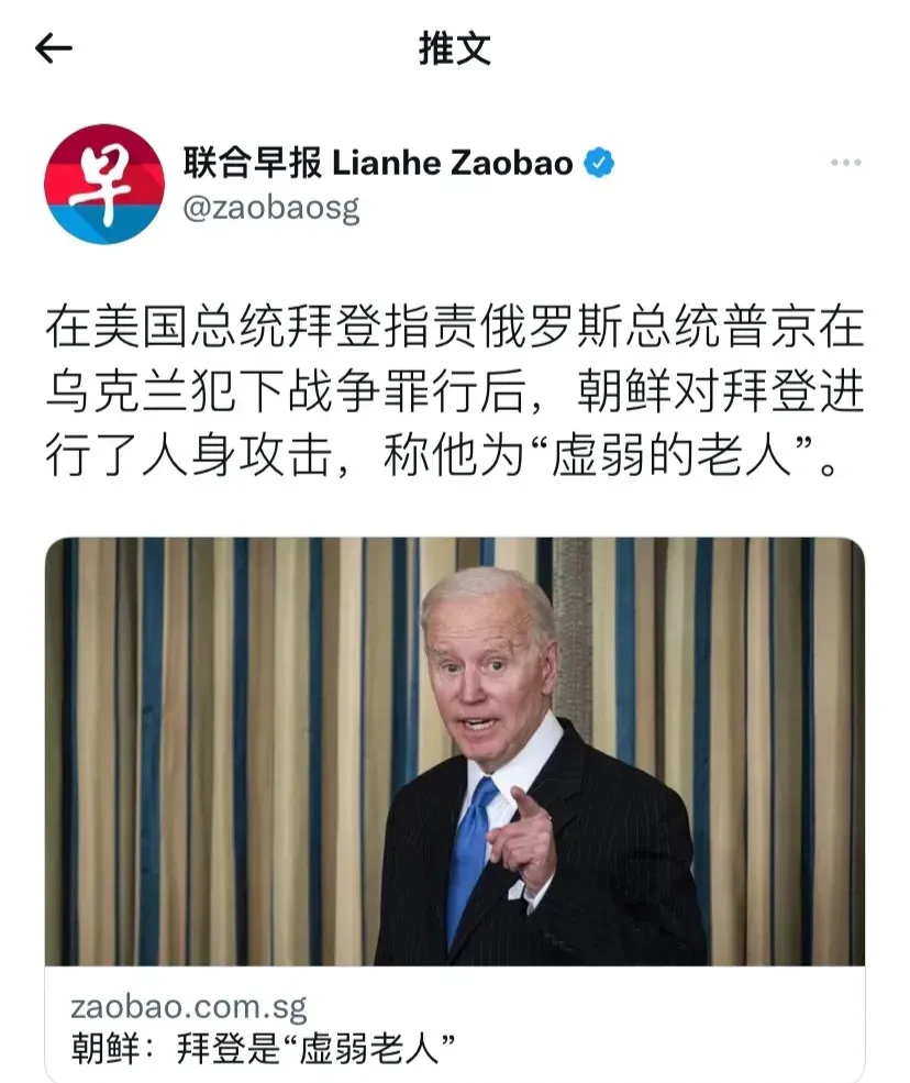 朝鲜这是要挑衅美国吗?联合早报4月11日发文说“朝鲜对拜登进行了人身攻击,称他为‘虚弱