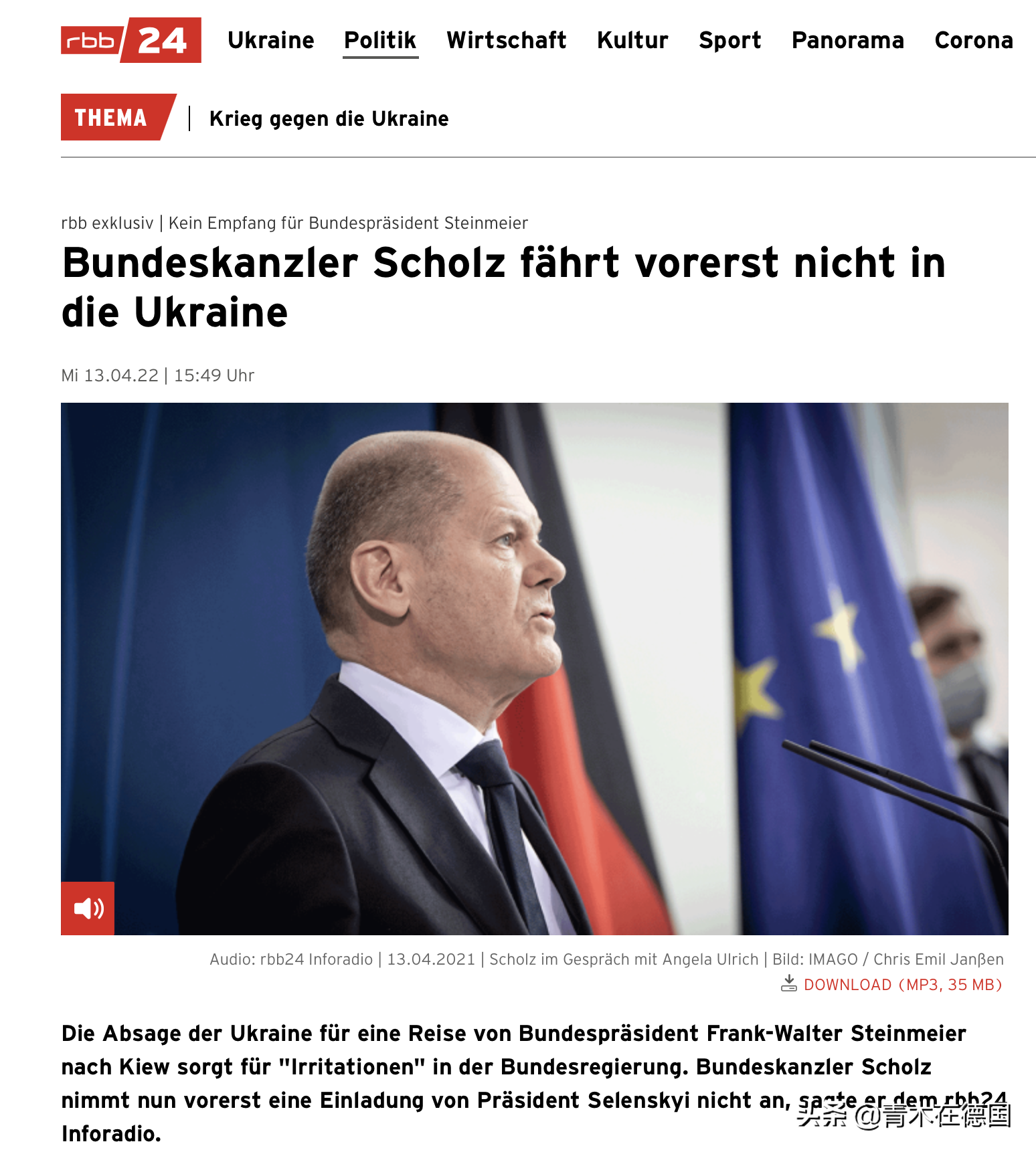 德国总理强硬回应:暂时不接受泽连斯基的邀请!基辅冒犯德国总统引发“连环效应”“愤怒是巨大的!”德新社13日报道,乌克兰总统泽连斯基12日拒绝德国总统施泰因迈尔在俄乌冲突的关键时刻出访基辅,引发德国国内的一片哗然。德国RBB电视台报道称,朔尔茨接受采访时表示,施泰因迈尔未能得到接待“令人恼火”,他暂时不愿接受泽连斯基的邀请。施泰因迈尔12日在结束对波兰的访问后,原本计划与波兰总统,以及立陶宛、拉脱维亚和爱沙尼亚这三个波罗的海国家的元首前往乌克兰。但就在出发前夕,基辅方面告知德国总统,他眼下在基辅“不受欢迎”。施泰因迈尔得知后表示:“我本来是准备好前往基辅。但是很明显——我必须认识到——基辅却并不这样想”。然而,就在德国总统表态后,在德国争议很大的乌克兰驻德国大使梅尔尼克周二晚上在德国ProSieben等电视台上“火上浇油”称,“如果朔尔茨总理访问基辅,我的总统和政府会非常高兴。”这次访问应该是关于德国如何在与俄罗斯的战斗中用重型武器帮助乌克兰。“我的总统对此充满期待,”梅尔尼克说。乌克兰总统泽连斯基的顾问阿列斯托维克当晚在接受德国电视一台采访时表示:可以保证乌总统在决定的时候是“权衡再三”的。泽连斯基没有邀请德国总统,而是邀请了德国总理朔尔茨的理由是:后者“能够做出一些实际的决定”。青木观察到,这完全激怒了德国政治圈,甚至可能让泽连斯基付出代价,主要体现在“三个方面”:首先,德国政府和联邦议员对泽连斯基的信任正在消失。这政党之一的社民党外交事务主管施密特表示,基辅拒绝邀请德国总统的做法是“一场政治上的廉价闹剧”。社民党议会领袖穆策尼奇周三呼吁所有党派保护国家元首“免受无理攻击”。他要求乌克兰代表遵守最低限度的外交公约,并警告乌克兰不要干涉德国国内政治。其次,德国可能会减缓对乌克兰的经济和军事支援。德国绿党议员齐默尔曼认为,泽连斯基这样做的目的是:如果你不邀请德国总统,德国总理会更快去基辅,给乌克兰重型武器。“这是荒谬的。”《巴登邮报》称,泽连斯基这种冒犯会让他失去德国的同情心,而(同情心)往往会增加对德国对乌克兰更坚定的支持。自民党籍的德国联邦议院副议长库比茨基指出,无法想象总理会前往一个宣布德国国家元首为不受欢迎的人的国家。最终结果是,朔尔茨现在也谢绝了泽连斯基的邀请。其三,这可能会打击泽连斯基的“激进外交”。《西南新闻报》说,到目前为止,泽连斯基的“激进外交”取得了极大的成功。他通过视频演说,向欧盟及成员国施压,取得许多的支持。但他这次他显然做得过火,破坏欧洲对乌克兰的团结。