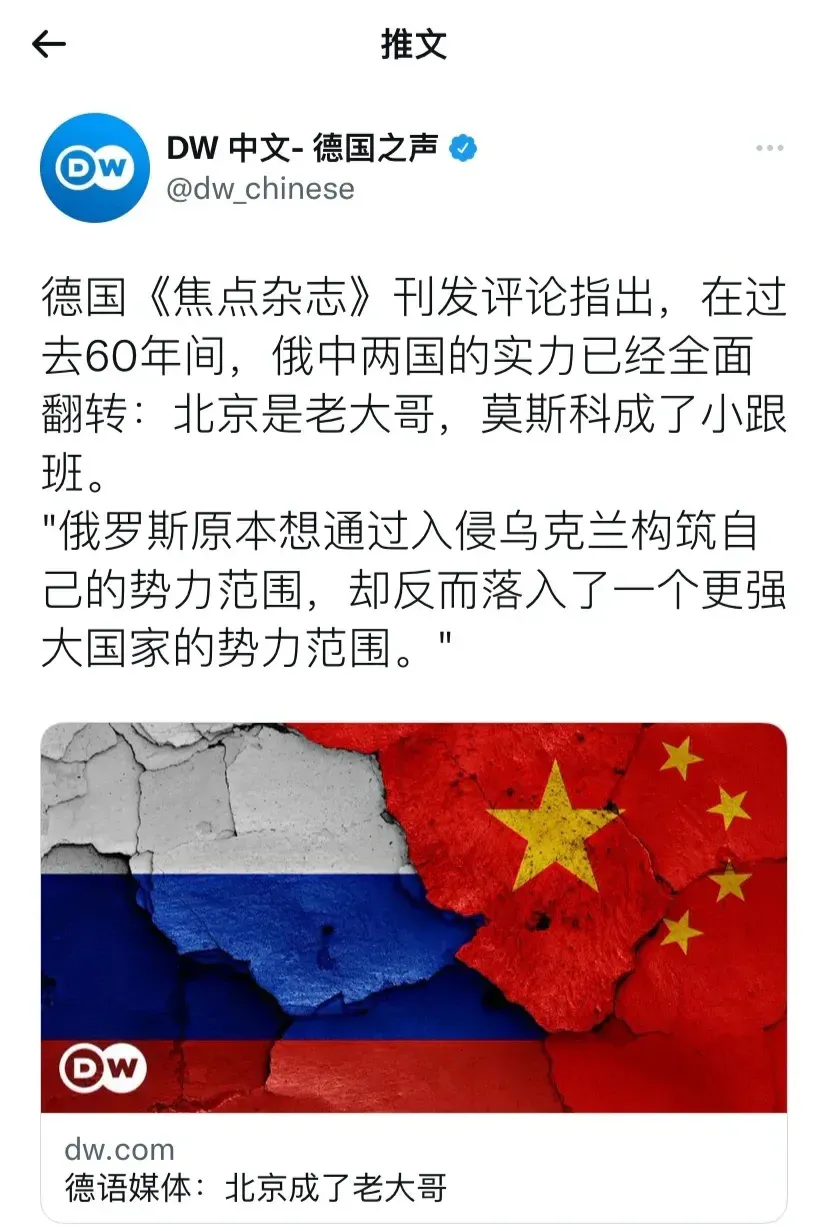西方离间中俄关系可以说不遗余力,“北京是老大哥,莫斯科成了小跟班”,德国之声是想说,