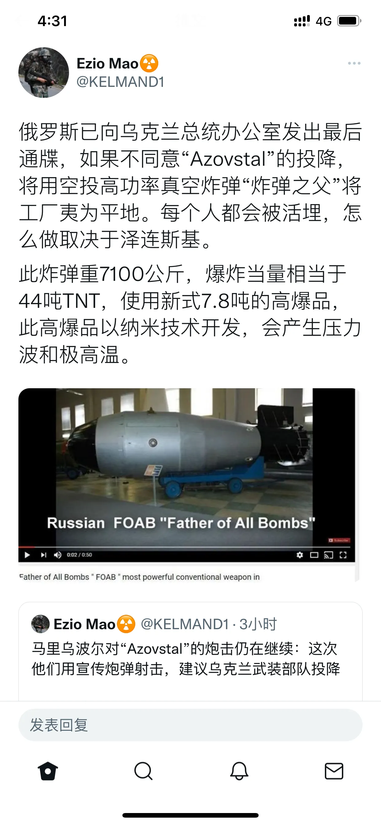 ezio:俄罗斯已向乌克兰总统办公室发出最后通牒,如果不同意“Azovstal”的投降,将用空投高功率真空炸弹“炸弹之父”将工厂夷为平地。每个人都会被活埋,怎么做取决于泽连斯基。此炸弹重7100公斤,爆炸当量相当于44吨TNT,使用新式7.8吨的高爆品,此高爆品以纳米技术开发,会产生压力波和极高温。