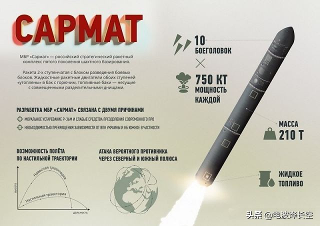 俄军最新的陆基洲际弹道导弹,是俄罗斯新一代三位一体核打击装备的重要一环。该弹的起飞重量高达208吨左右,最多能够携带10到15个小型核弹头,也可以携带最新的先锋高超音速滑翔飞行器,外界评估其射程则是高达18000公里。俄罗斯方面称萨尔马特的助推阶段较短,不容易被