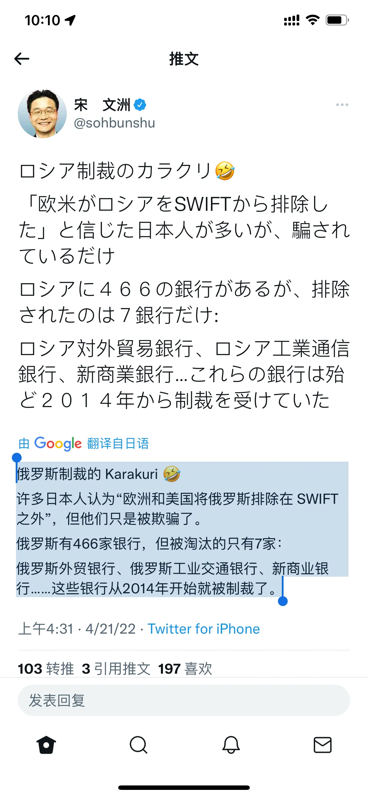 宋文洲:俄罗斯制裁的窍门 许多日本人认为“欧洲和美国将俄罗斯排除在 SWIFT 之外”,但