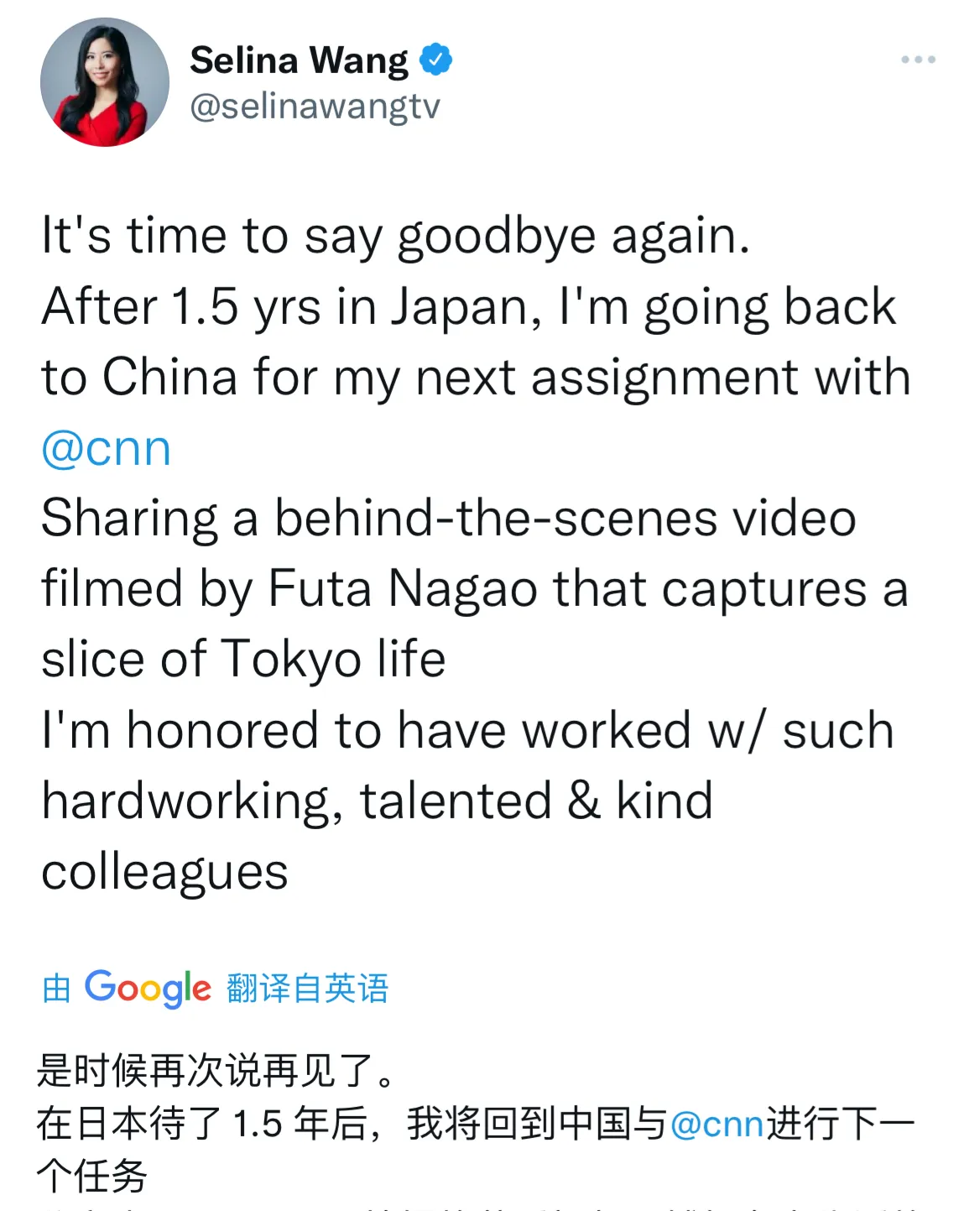 出生在中国CNN记者Selina Wang宣布自己结束在日本的任期,马上要回到中国工作。大家对她有