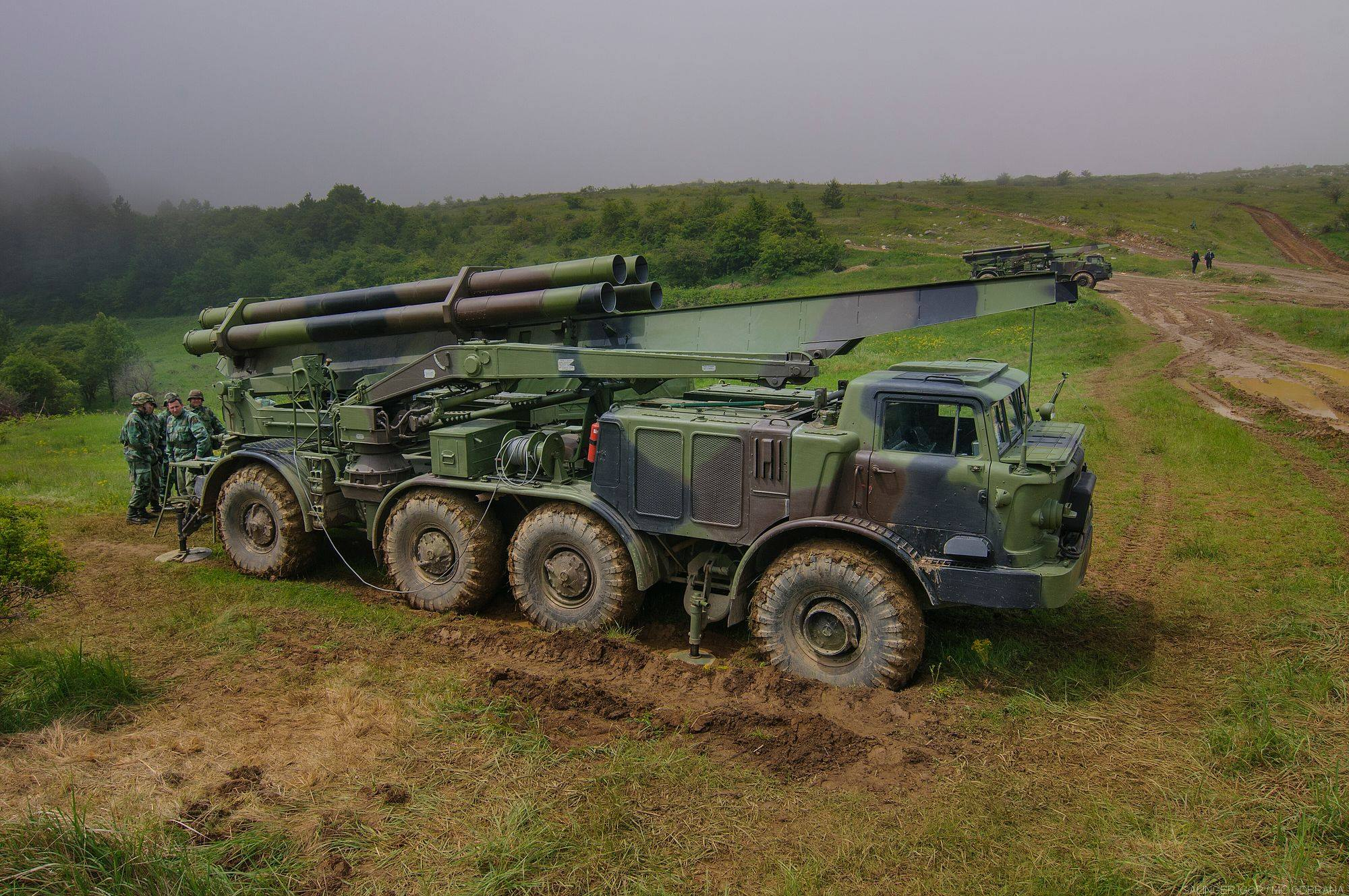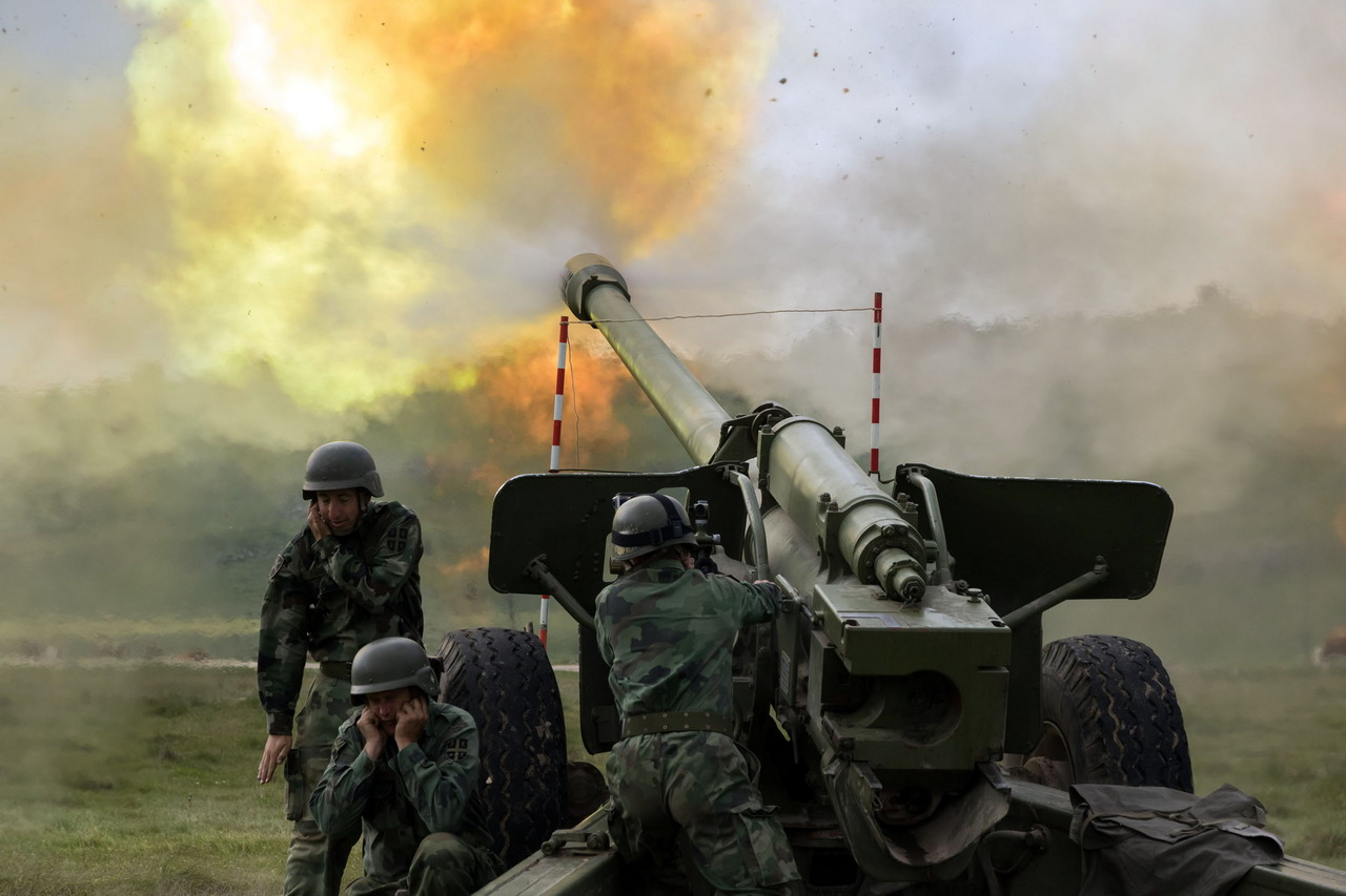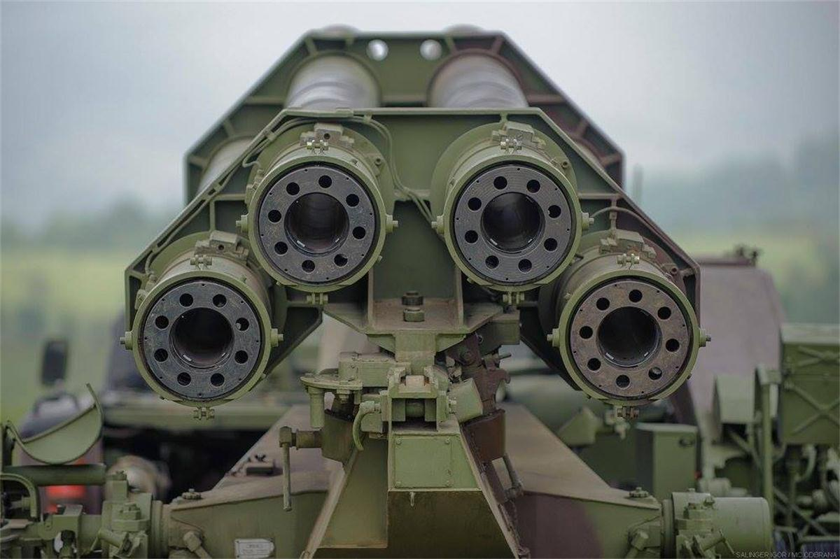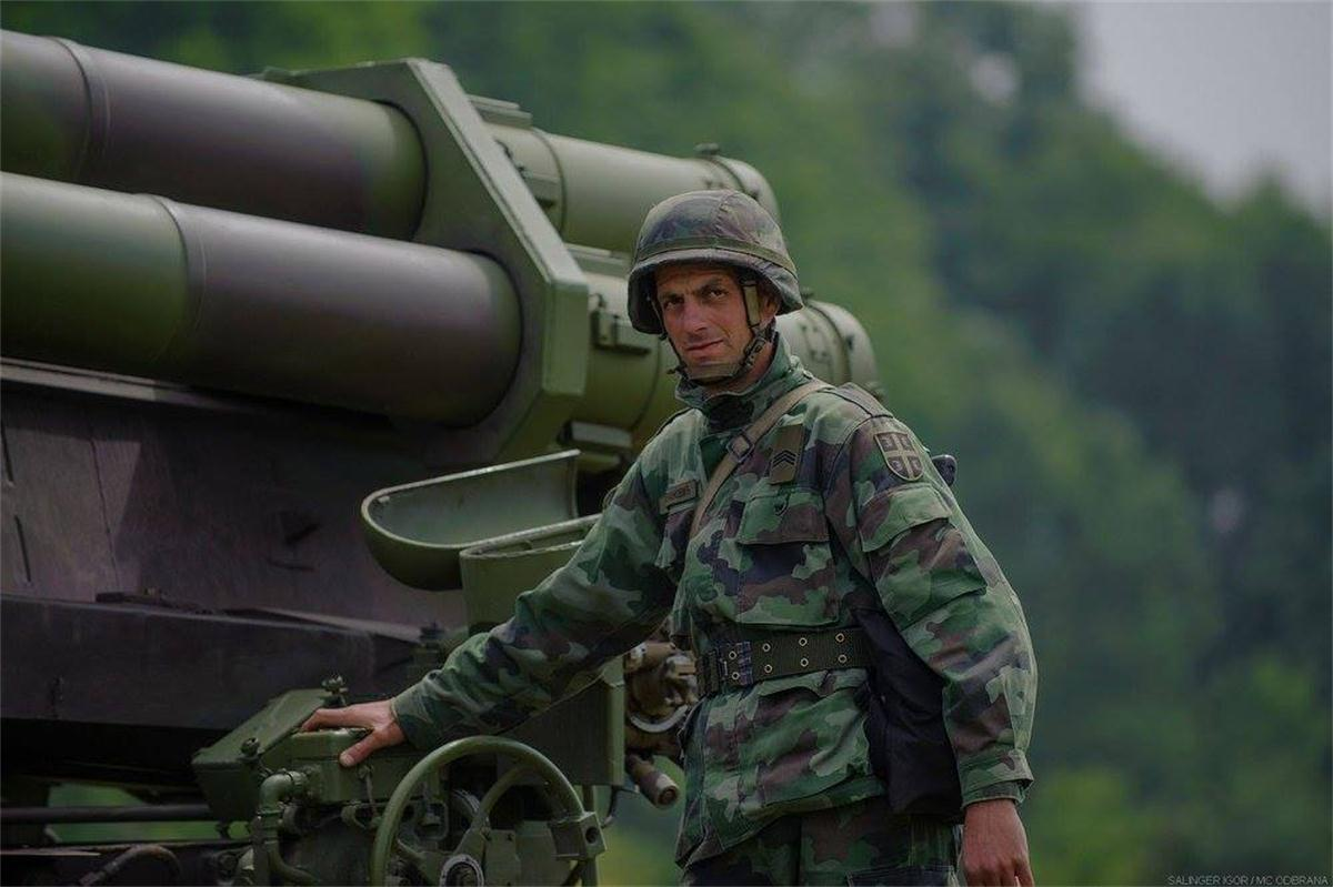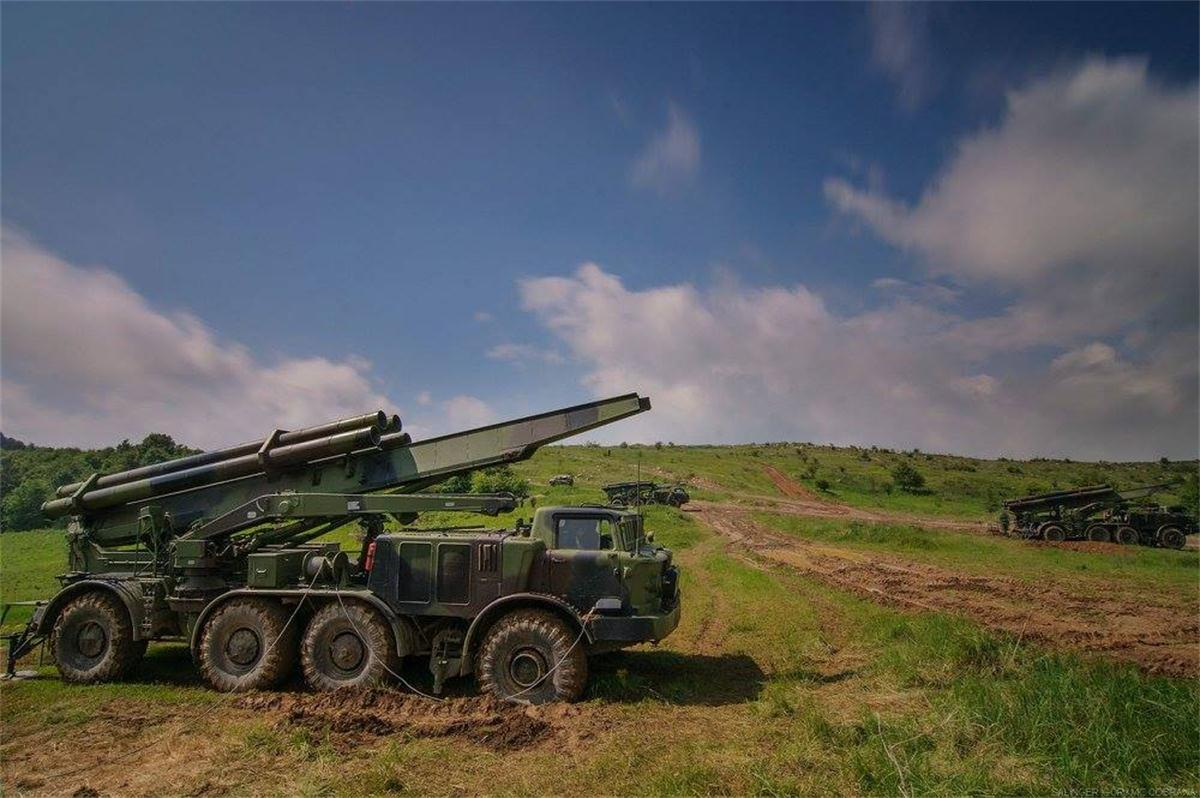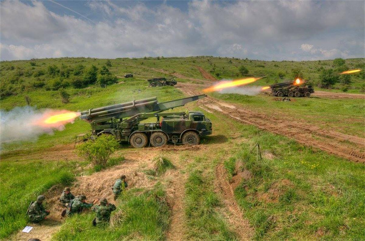塞尔维亚装备130毫米M-46加农炮和262毫米M-96 MRL Orkan II 火箭炮系统的炮兵营实弹射击演