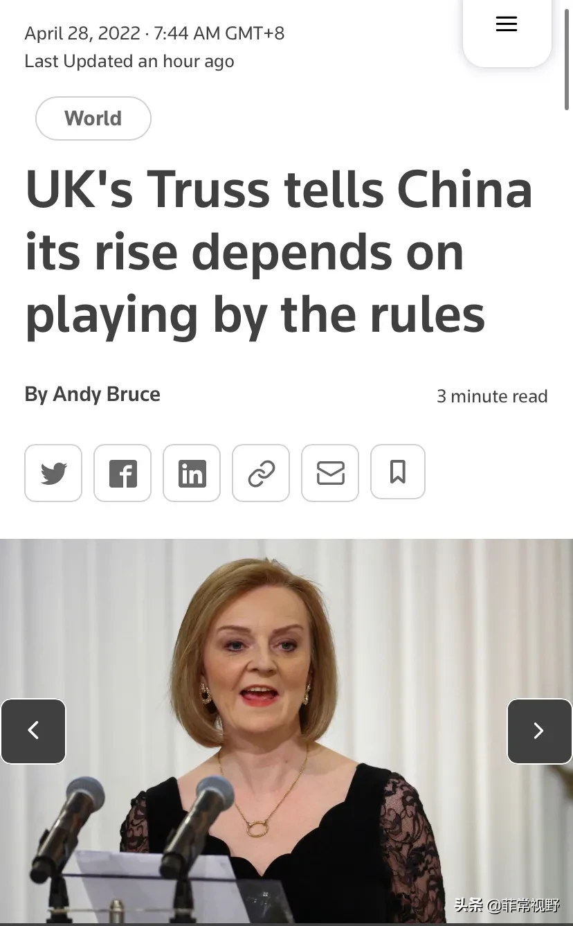 路透社4月28日:英国特拉斯告诉中国,它的崛起取决于遵守规则