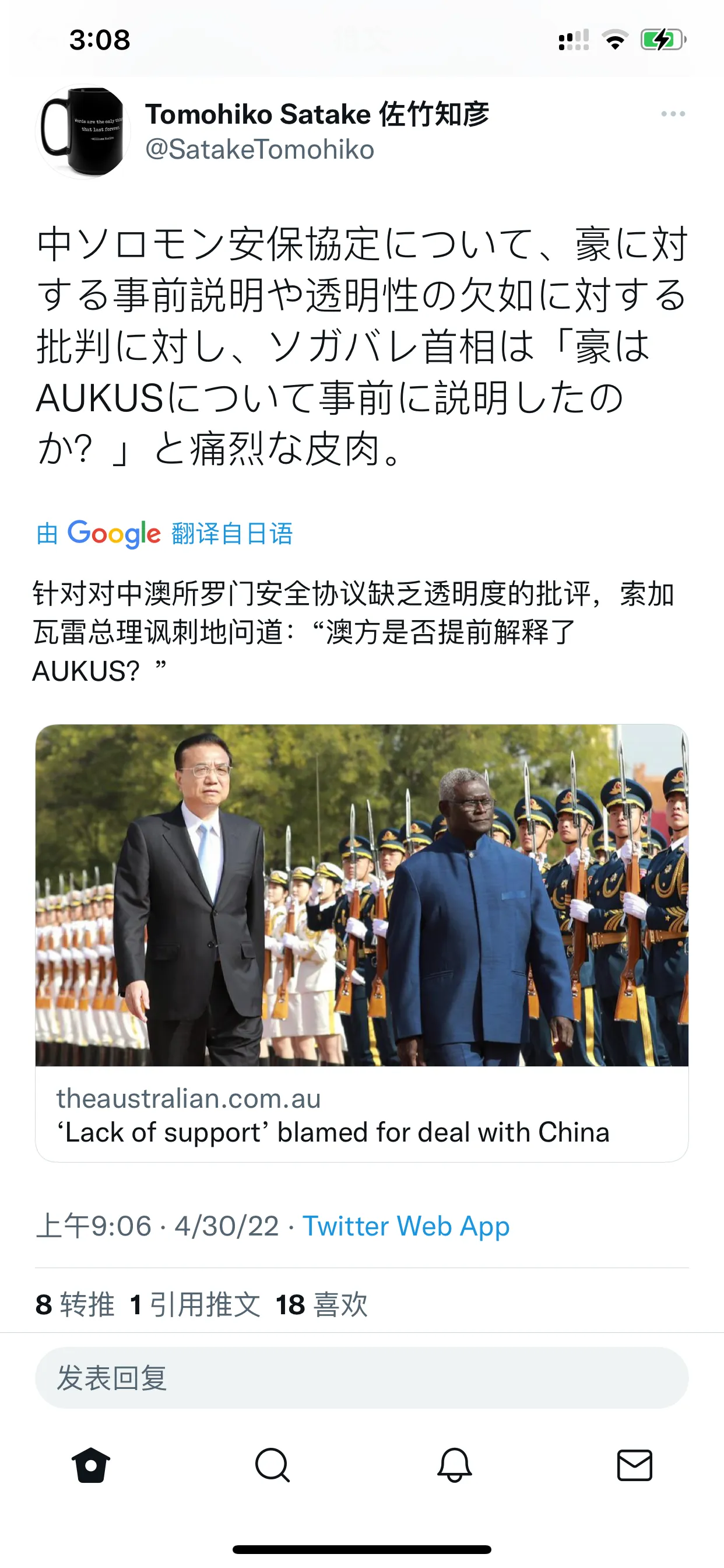 针对对中澳所罗门安全协议缺乏透明度的批评,索加瓦雷总理讽刺地问道:“澳方是否提前解释了AUKUS?”