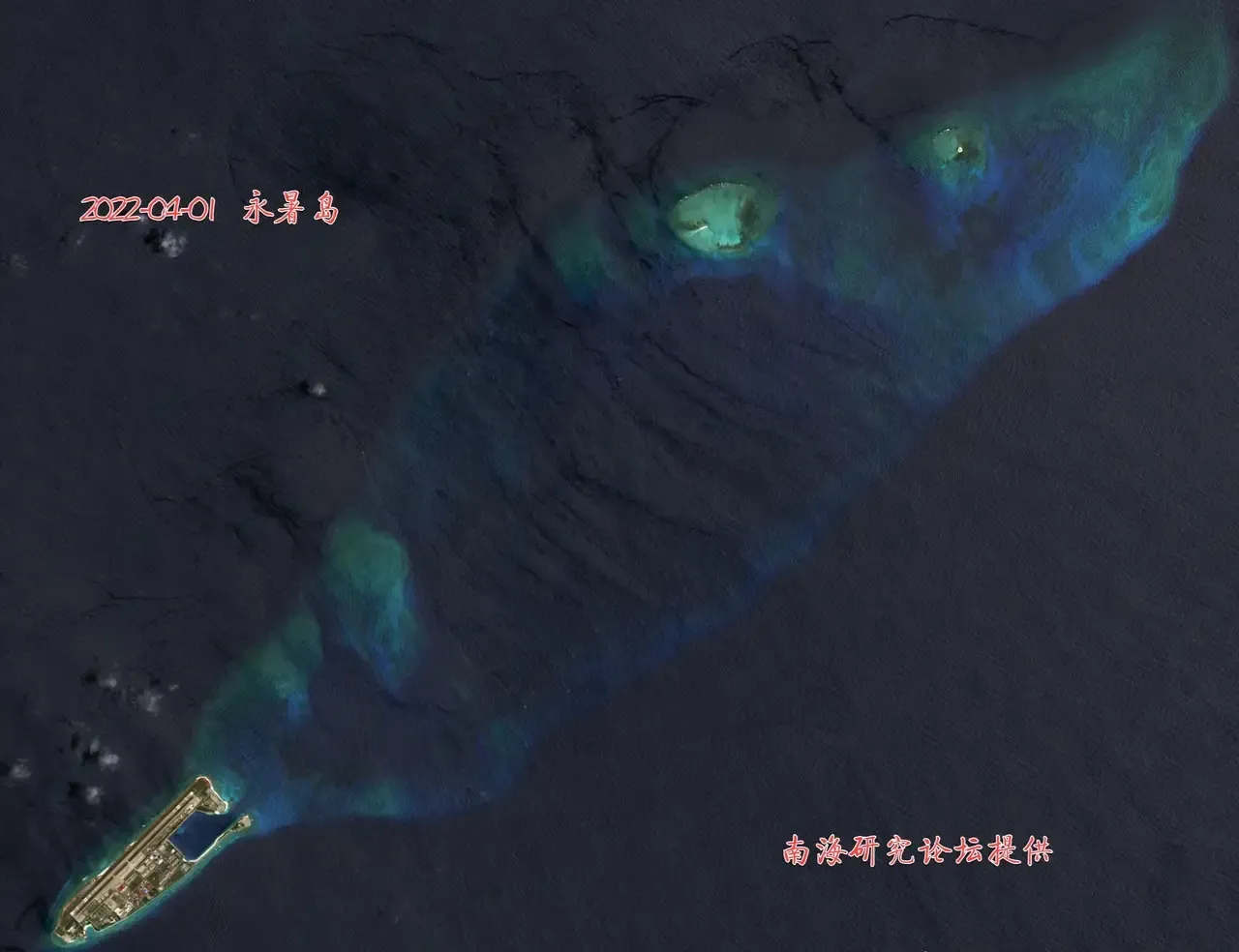 永暑礁,位于南沙群岛中部,呈长椭圆形,分为西南知东北两块,整个礁盘长26公里,宽约7.8