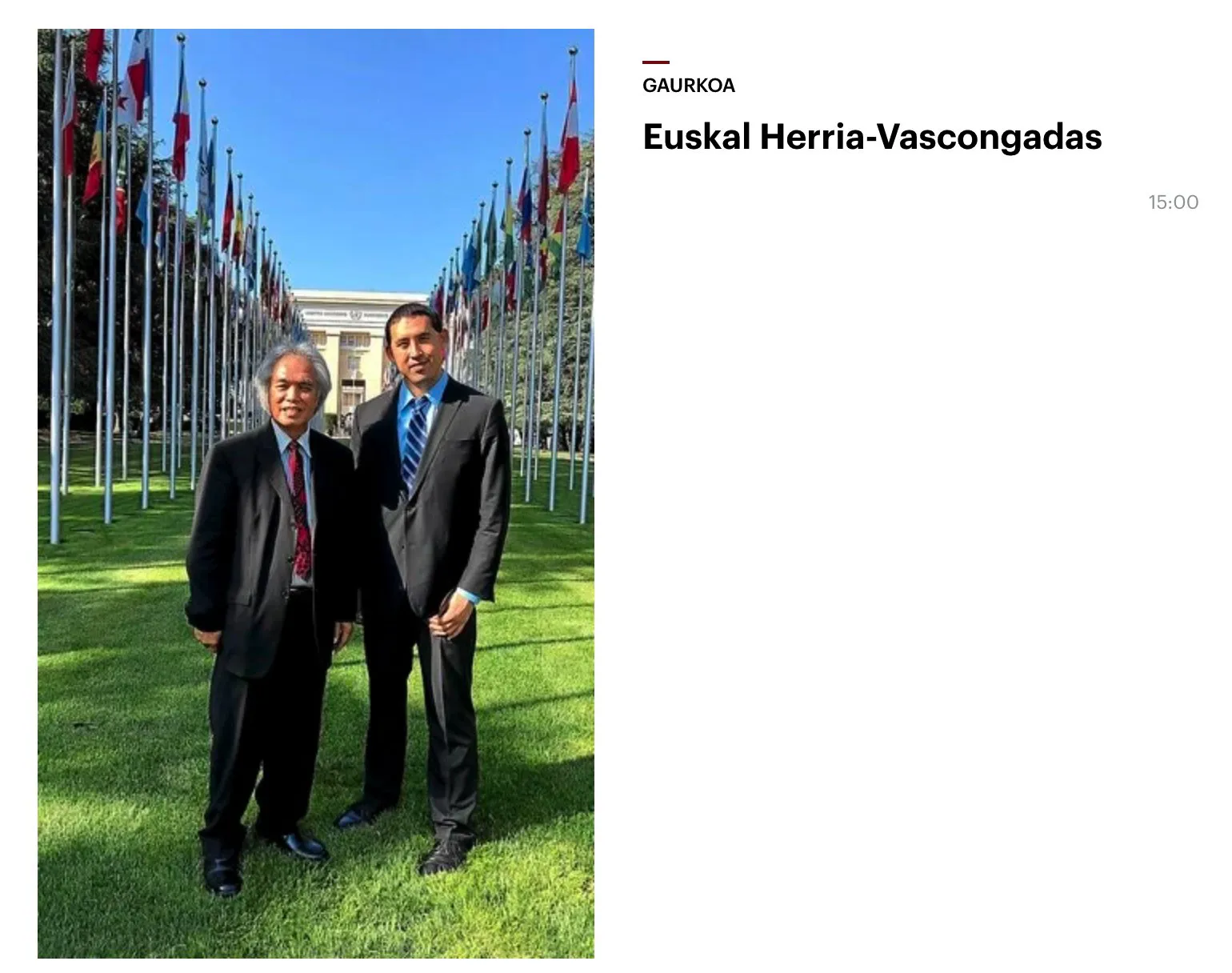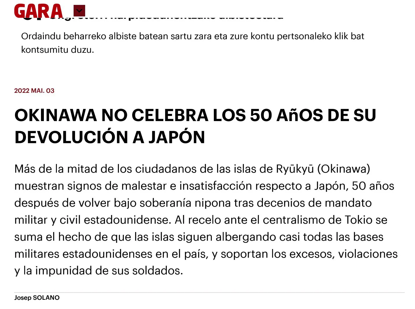 要求琉球群岛独立的比嘉:今天巴斯克报纸发表了一篇关于我的文章。你听说过巴斯克语吗?它位于西班牙和法国之间。巴斯克人有自己的语言、文化、历史和身份。但在 19 世纪,西班牙入侵了它。因此,由于类似的问题,巴斯克人对琉球感兴趣。希望巴斯克和琉球能够继续相互了解,合作!