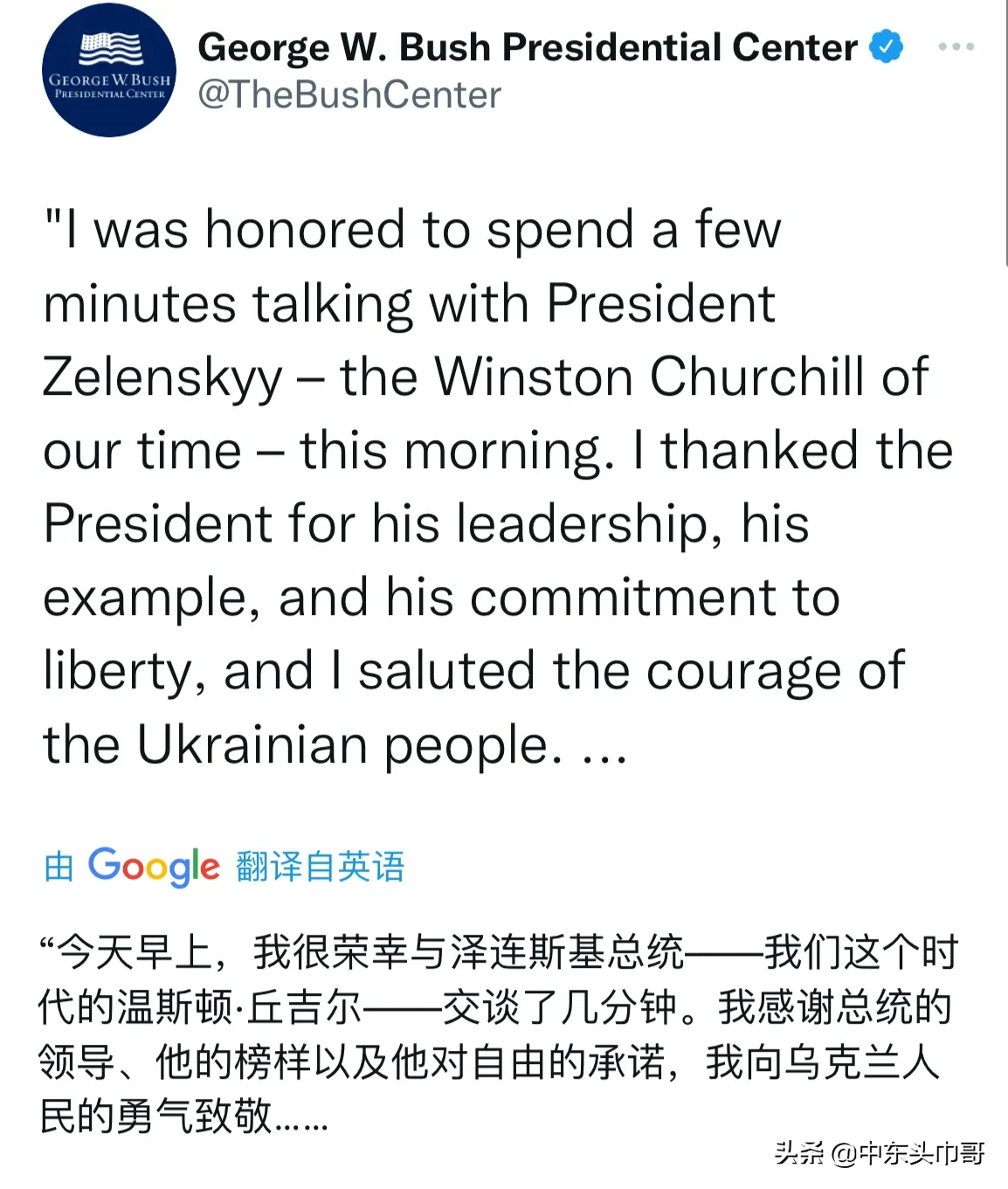 “看啊,小布什现在开始反对‘入侵’主权国家”,曾经在任内非法入侵伊拉克的美国前总统小布什说自己5日与乌克兰总统视频会见,称赞泽连斯基是“我们这个时代的温斯顿·丘吉尔”。但美国人关注点在于,小布什这么一个被历史记录的入侵伊拉克的战争贩子,和泽连斯基聊“入侵其他国家”到底有什么资格?他如果谴责“入侵其他国家”,那岂不是在骂自己?但美国把前总统推出来给泽连斯基鼓气加油的目的也被揭穿,“美国很乐意提供武器来延长他们知道乌克兰无法获胜的战争,而西方贵宾犬泽连斯基也很乐意配合。如果这意味着削弱俄罗斯,美国会很高兴看到乌克兰被夷为平地。在达成和解之前,越来越多的人会死去。”点评:学英语了,Western Poodle,西方贵宾犬。