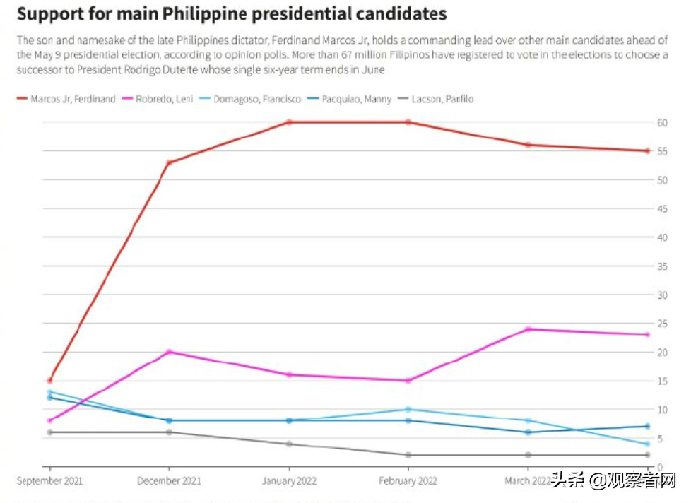 【#菲律宾前总统之子有望赢得大选#】综合外媒报道,菲律宾前独裁者费迪南德·马科斯之子有望当选新一届总统。Pulse Asia最近一份民调显示,小马科斯支持率高达56%,而排名第二的罗布雷多仅为23%,前者优势明显。菲律宾将于5月9日举行大选,现任总统杜特尔特将结束自己6年的任期。费迪南德·马科斯曾于1965-1986年间统治菲律宾,以腐败的裙带资本主义和政治打压的威权主义闻名于世。1986年第四次当选总统,但因选举舞弊导致群众大规模抗议而被迫流亡美国夏威夷。分析称,小马科斯利用社交媒体吸引大量年轻选民支持,并淡化对其政治家族的历史争议。他选择现任总统杜特尔特之女作为自己的竞选伙伴,也一定程度上提高了自己的支持率。