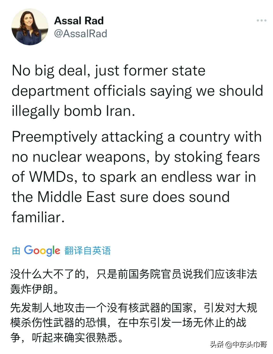 美国前国务院官员扬言要向伊朗开战,“现在是美国转向下一个选项的时候了,就是用军事手段消除伊朗各种核设施。美国当然有能力这样做,”并且可以比以色列更快、更容易地做到这一点。伊朗姑娘对此不屑一顾,“没什么大不了的,不过是前国务院官员说我们应该非法轰炸伊朗。先发制人地攻击一个没有核武器的国家,引发对大规模杀伤性武器的恐惧,在中东引发一场无休止的战争,听起来确实很熟悉。”点评:大家判断美国不会与伊朗开战,不是因为美国在道义上不会这样做,毕竟美国曾毫不犹豫地发动伊拉克等战争,而是美国在实力上已经不允许任性发动战争了。“美国希望在不打仗的情况下,以最低代价实现其目标:遏制伊朗。”美国在中东维护其霸权地位,关键目的在于控制地区石油秩序,而遏制挑战者伊朗,由此便成为其地区政策的重要目标。
