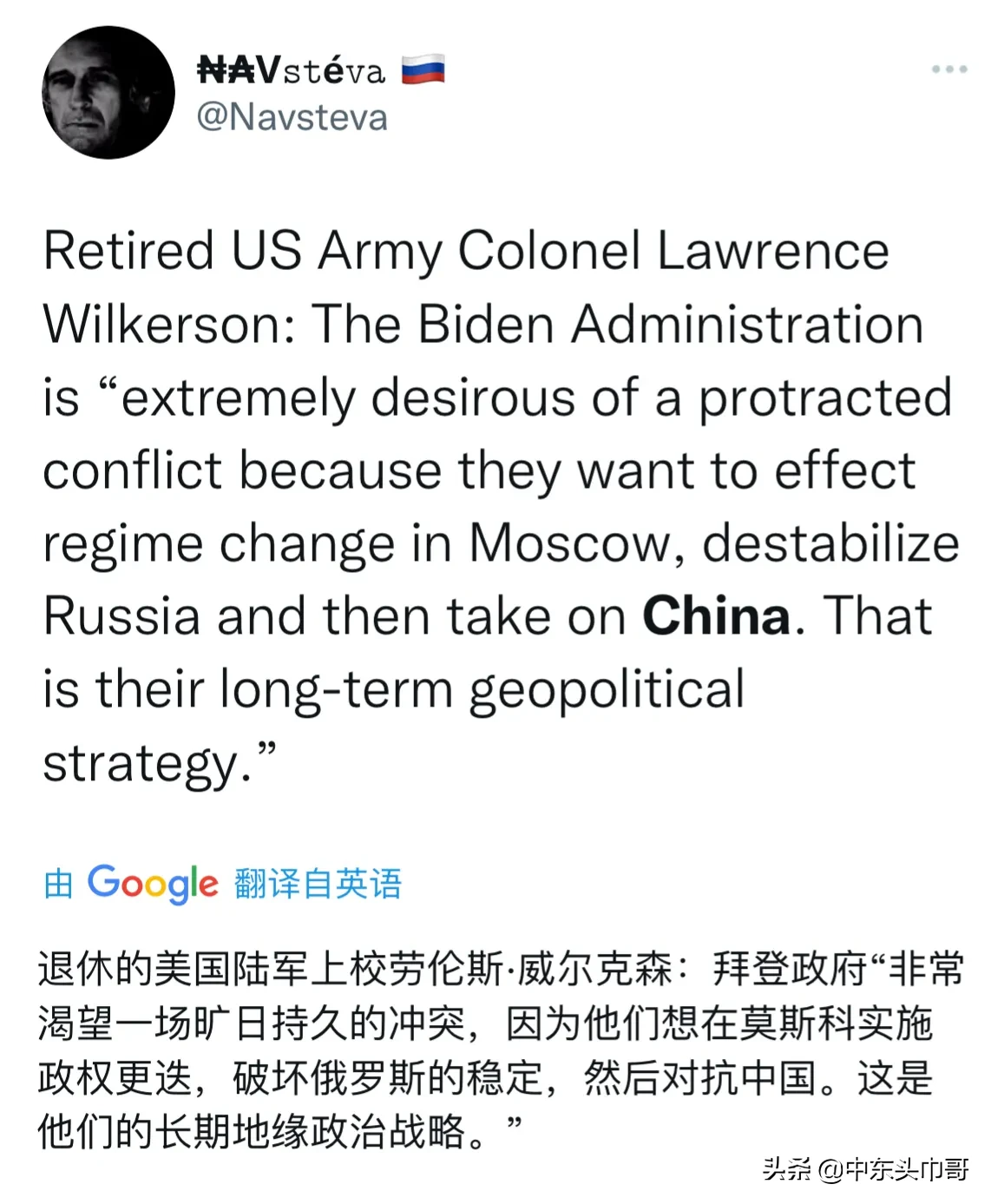 退休的美国陆军上校劳伦斯·威尔克森:拜登政府“非常渴望一场旷日持久的冲突,因为他们想在莫斯科实施政权更迭,破坏俄罗斯的稳定,然后对抗中国。这是他们的长期地缘政治战略。”点评:美国目标还有顺带坑垮欧洲,等冬天来临,欧洲人取暖困难、物价上涨,到时候欧洲能体会到更多苦楚和动荡,欧洲政客们或许会为他们盲目追随美国后悔。