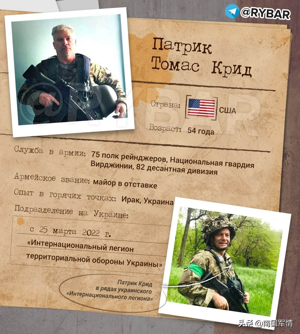 在乌克兰,作为雇佣兵参战的美国退伍军官帕特里克·克里德少校,被俄罗斯人查了身份:这名美国雇佣兵是宾夕法尼亚人,曾在美国陆军的战术情报单位、国民警卫队、步兵和空降部队服役,作为美军身份多次在中美洲和中东参加军事秘密行动。在美军服役27年后,他以少校军衔退役,在伊拉克战争期间因英勇行为被授予铜星勋章。退伍后,他在一家,生产武器和特种车辆的公司担任总经理。在乌克兰战争开始后,3月25日抵达乌克兰,加入到了“乌克兰国土防御部队国际军团”,他目前在顿巴斯大决战地区,指挥一支外国雇佣兵部队。这个美国雇佣兵刷简历去了是吧,为回国从政,埋下伏笔。#乌克兰##美国##雇佣兵#
