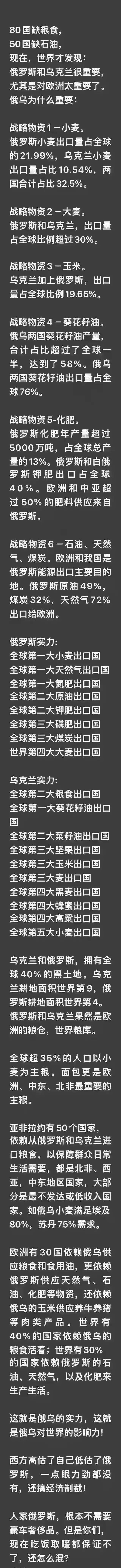 这个世界被搅成啥样了,80个国家缺粮食,50个国家缺石油。联合国公开求俄罗斯说,没有俄罗斯的参与,国际社会将无法解决粮食危机,因为俄罗斯的粮食和化肥。我想俄罗斯不会见死不救,但也会提条件,这里我提一句,不如条件就是解散北约组织,将乌克兰、波兰、芬兰去军事化,这样的条件能行么?
