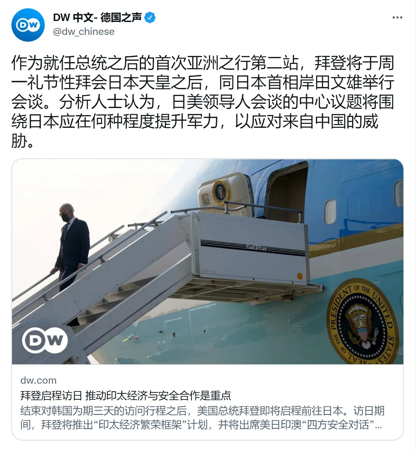 德国之声今天发文说:“作为就任总统之后的首次亚洲之行第二站,拜登将于周一礼节性拜会日