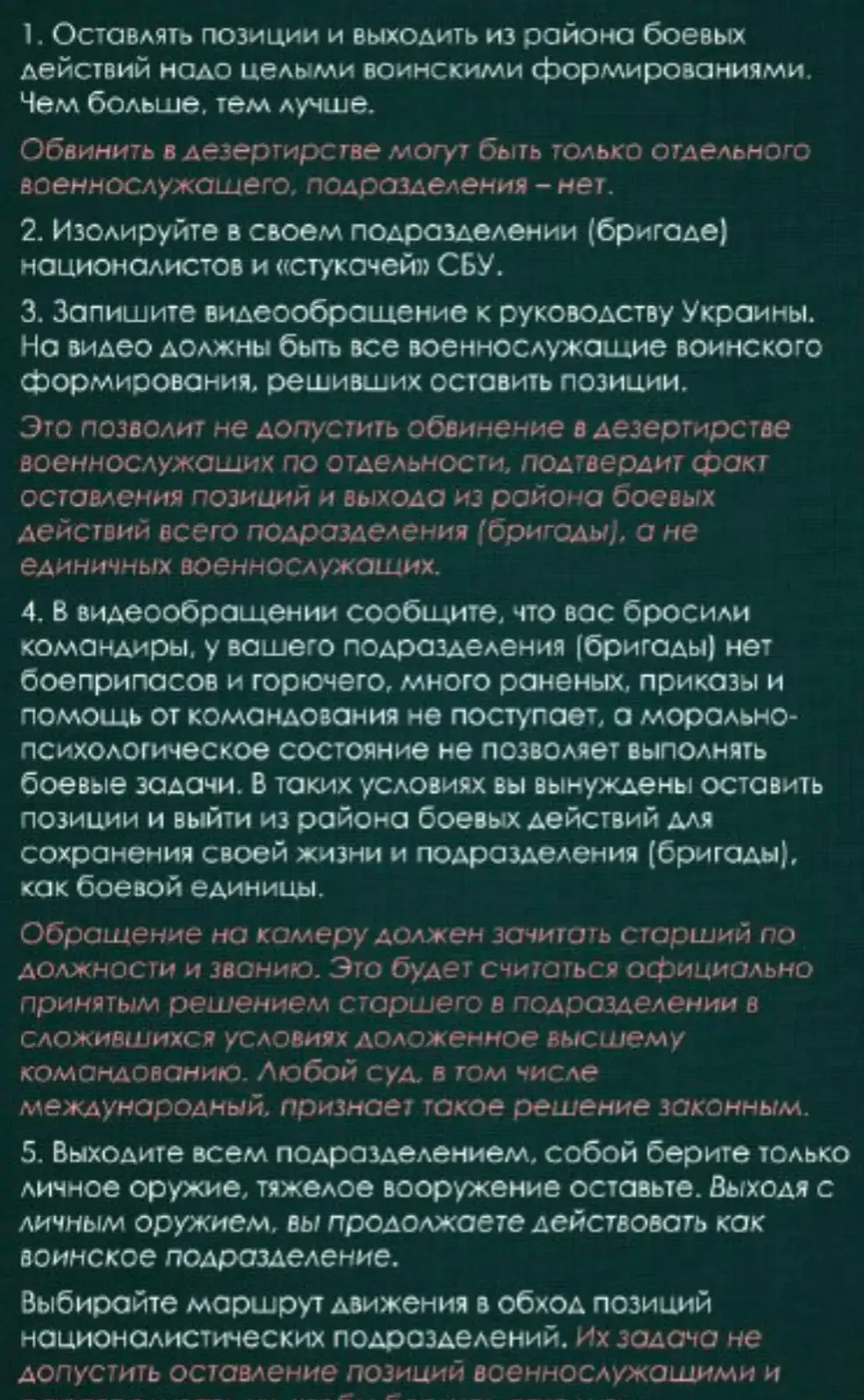 俄罗斯加大了对乌军的心理攻势,发布了“投降指南”:1、最好带着整过军事单位离开阵地,人越多越好。因为只有个别军人才被指控开小差,而军事建制单位是不能被指控的。2、在投降部队中隔离亚速营的民族主义者和“告密者”。3、录制一段视頻信息给乌克兰总统。所有决定投降的军事人员都应该出现在视频中。4、告之上级指挥官抛弃了你,部队没有了弹药和燃料,有许多伤员,部队的精神和心理状态不允许执行战斗任务。大家被逼离开阵地和战区,以拯救部队官兵的生命。阅读声明应该由职位和级别较高的人来进行,这将被视为部队高级军官的正式决定。任何法院都承认这样的决定是合法的。5、投降部队放弃重武器,只携带防身轻武器,这样仍然算军事单位投城,而且部队撤离应该绕过亚速营等极端主义分子的阵地。