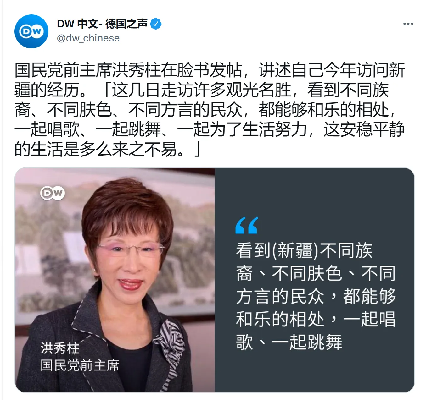 德国之声今天发文说:国民党前主席洪秀柱在脸书发帖,讲述自己今年访问新疆的经历。“这几