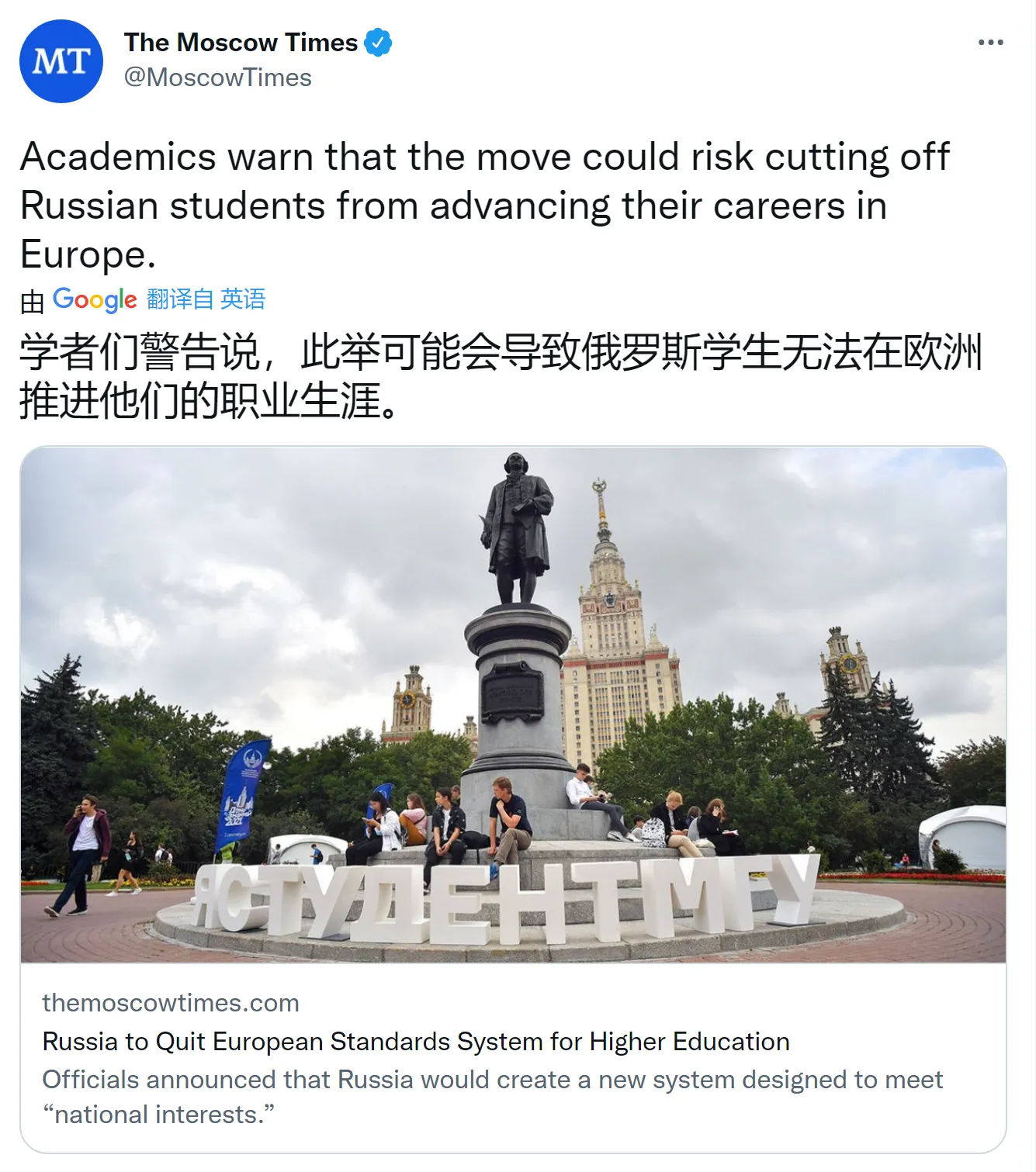 莫斯科时报今天发文说:俄罗斯将退出欧洲高等教育标准化协议。俄罗斯科学和高等教育部长瓦