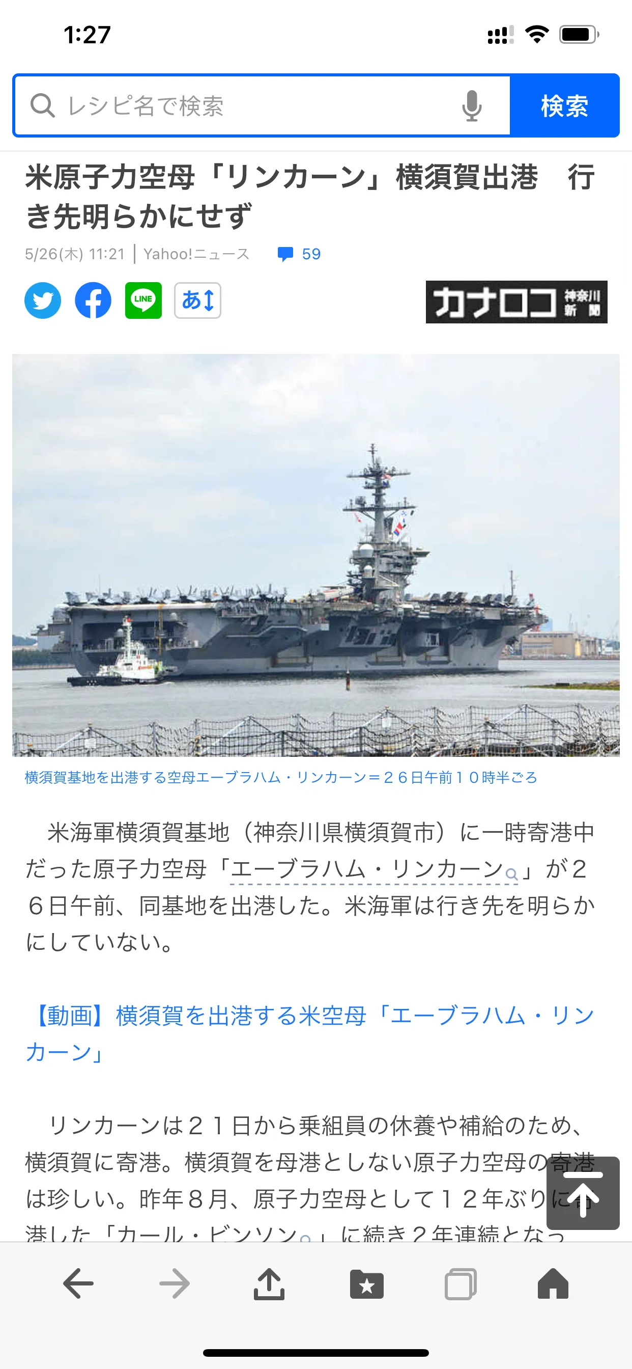正在美国海军横须贺基地(神奈川县横须贺市)暂时停靠的原子能航空母舰“亚伯拉罕·林肯”26日上午从该基地起航。美国海军没有透露目的地。是去日本海威慑朝鲜还是要来南海?林肯21日起为船员休养和补给,停靠横须贺。不以横须贺为母港的核动力航空母舰停靠的情况很少见。去年8月,这是继作为核动力航母12年来首次停靠的“卡尔·宾逊”之后连续两年停靠。林肯是美国圣地亚哥为母港。横须贺是母港“罗纳德·里根”的同型舰,全长333米,乘员4779人。搭载里根所没有的最新锐隐形战斗机F35C和鱼鹰,拥有更强大的战斗力。