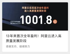 纵观中国企业发展史,很少有企业像阿里巴巴这样:一直在进化,从未止步伐!从B2B到C2C、B2C,从电商平台到金融科技引擎、物流网络平台,从云计算、大数据到人工智能、AI芯片、量子科学。阿里巴巴,一直走在自我革新和衍进的前沿,与时消息、与时偕行、与时俱进。很多人说马云很了不起,吹过的牛都实现了。其实用极客公园创始人张鹏的话说可能更准确:阿里巴巴很不容易,把踩到的坑都填平了。——早年的长期投入项目,现在逐渐显现效果。你知道吗?阿里当时做云计算,其实源于阿里做“双11”的坑。2008年,双十一启动的第一年,IT能力对业务的束缚更加明显。当时阿里请了最牛逼的“IOE”(Oracle数据库、IBM服务器、EMC存储被合称为“IOE”)都没有把这个“坑”填平,可见这是多大的一个坑。后来,阿里做了一个与众不同的抉择:不管坑有多大,只要下定决心去填,就有可能。最终,阿里巴巴填平了这个坑,诞生了云计算,阿里云从此一发不可收拾,拉开了中国云时代的序幕。就在刚刚,阿里巴巴发布2022年财年年度报告显示,2021年阿里技术投入超1200亿元人民币,3年来一直在稳步增长。基于长年持续投入,阿里云实现了13年来首次盈利,成中国唯一实现盈亏平衡的云服务商。阿里云成功突破自我,跨过了盈利分水岭。但是迄至今日,阿里巴巴的迭代进化仍然没有终止,因为该填的坑还没有填完,AI芯片、量子计算是阿里巴巴踩到的新的坑,填平这些坑,需要时间,需要投入,需要努力,需要咬牙坚持。正如阿里云智能总裁张建锋所言:“盈利是一个自然而然的结果,这是对阿里云长期坚持技术投资的回报。我们将继续投入,寻求新的技术突破。”众所周知,技术研发投入是衡量创新力的关键标准,2021年我国研发投入强度2.44%,再创新高。阿里、腾讯等科技公司在云计算、芯片、AI、自动驾驶、量子计算等领域不断加大投入,已经成为科技创新的一股重要力量。“不自满,知不足。”最后引用最近爆火的一句话送给像阿里一样不断自我迭代和进化的企业,期待中国科技力量在世界舞台闪闪发光。