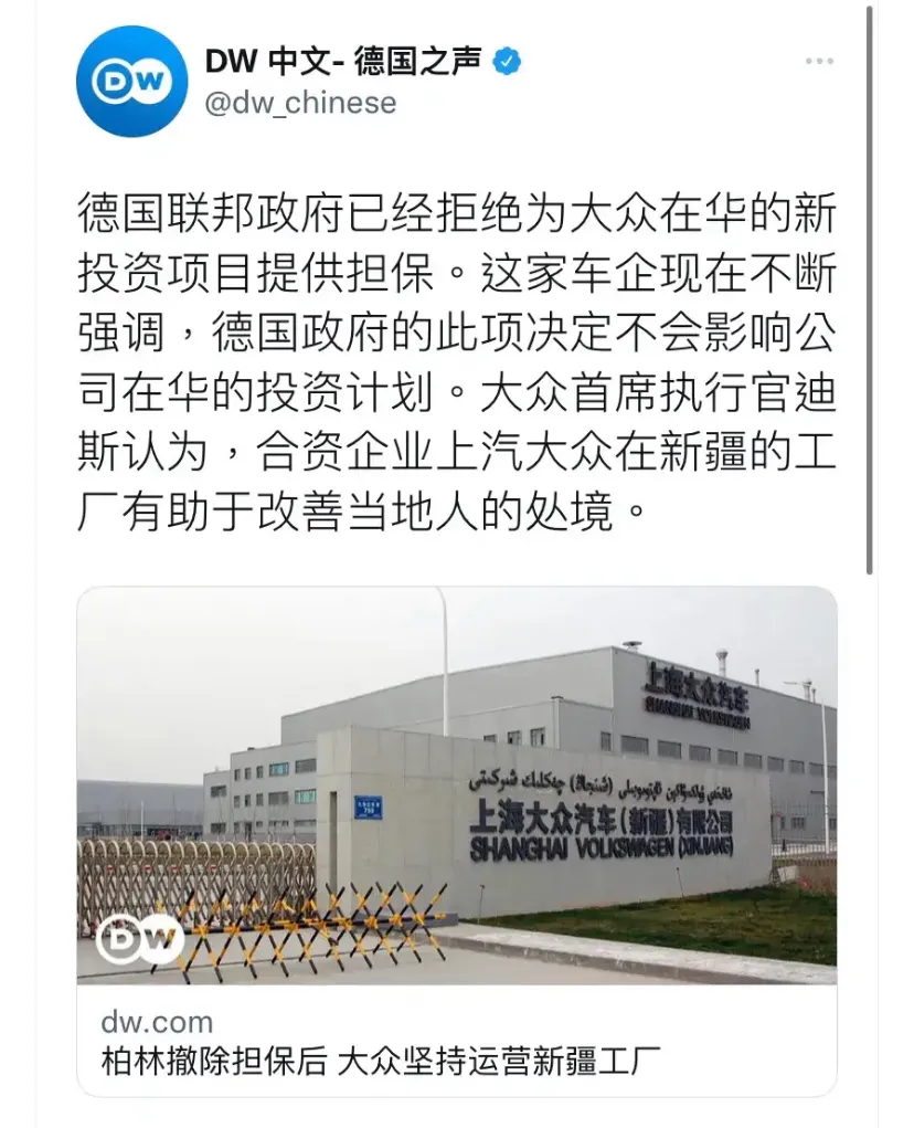 德国之声5月30日发文说:“德国联邦政府已经拒绝为大众在华的新投资项目提供担保。这家车企现在不断强调,德国政府的此项决定不会影响公司在华的投资计划。大众首席执行官迪斯认为,合资企业上汽大众在新疆的工厂有助于改善当地人的处境。”德国政府此举乃倒行逆施,投资新疆有助于促进当地经济社会发展,然而德政府却只知道附和美国制造的人权谎言,脑子里只剩制裁两个字,无视事实。德国若不能坚持和平、合作的国家发展路线,将付出极大代价。(投资项目)来了,我们欢迎;不来,天塌不下来。