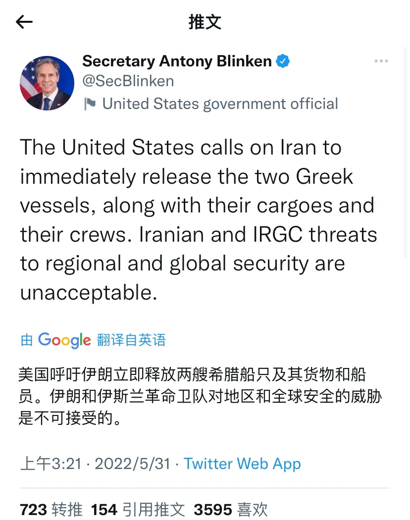 美国国务卿布林肯今天(5月31日)强调:“美国呼吁伊朗立即释放两艘希腊船只及其货物和船员。 伊朗和伊斯兰革命卫队 (IRGC) 对于区域和全球安全的威胁是不可接受的。”补充个信息:5月26日美国没收了希腊附近一艘俄罗斯运营的船只上的伊朗石油,并用另一艘船将货物送往了美国。